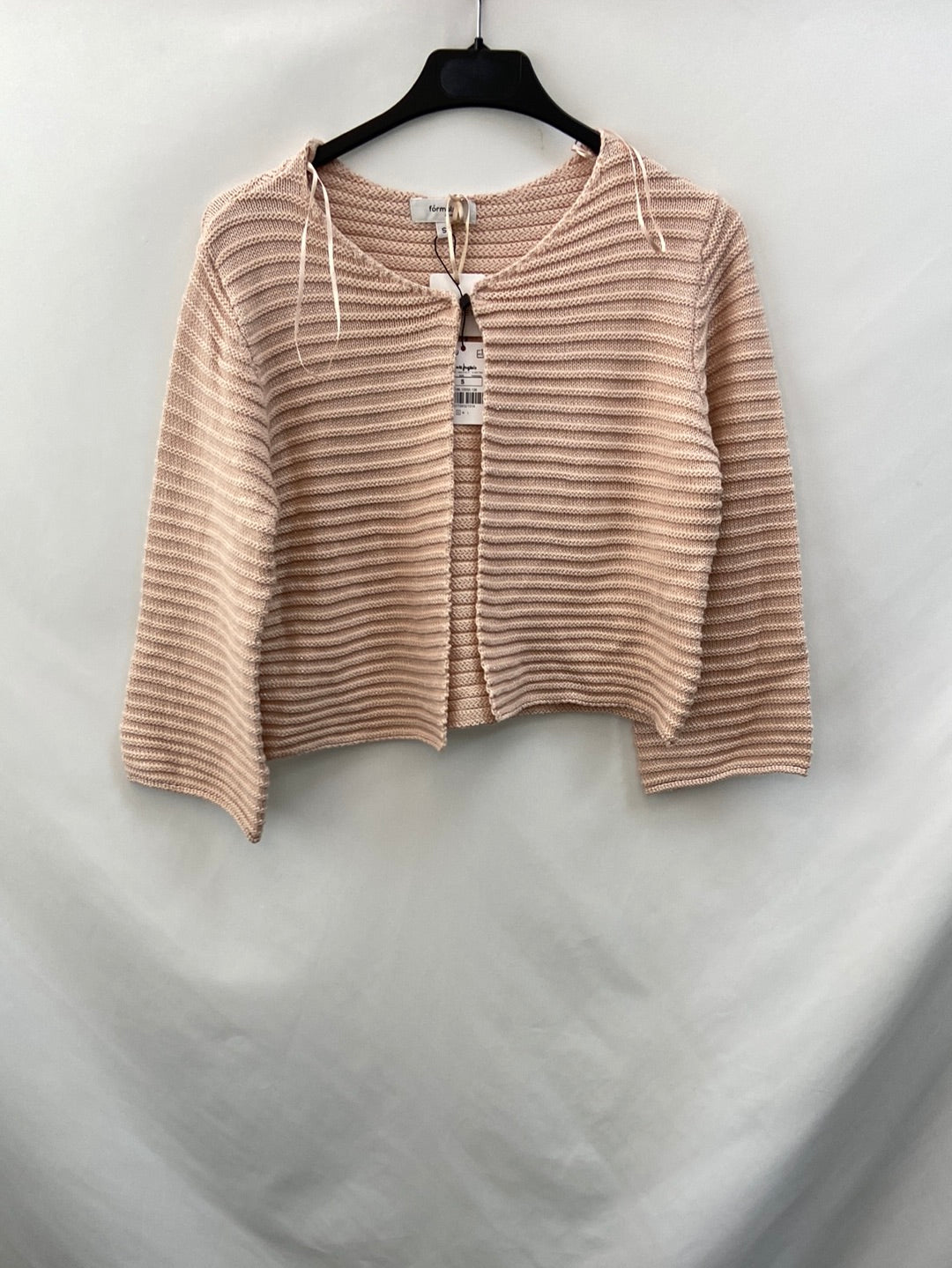NUEVO CON ETIQUETA. Rebeca rosa con hilos plateados de canalé. Elástico. Se abrocha solo por el cuello. Largo 40 cm
