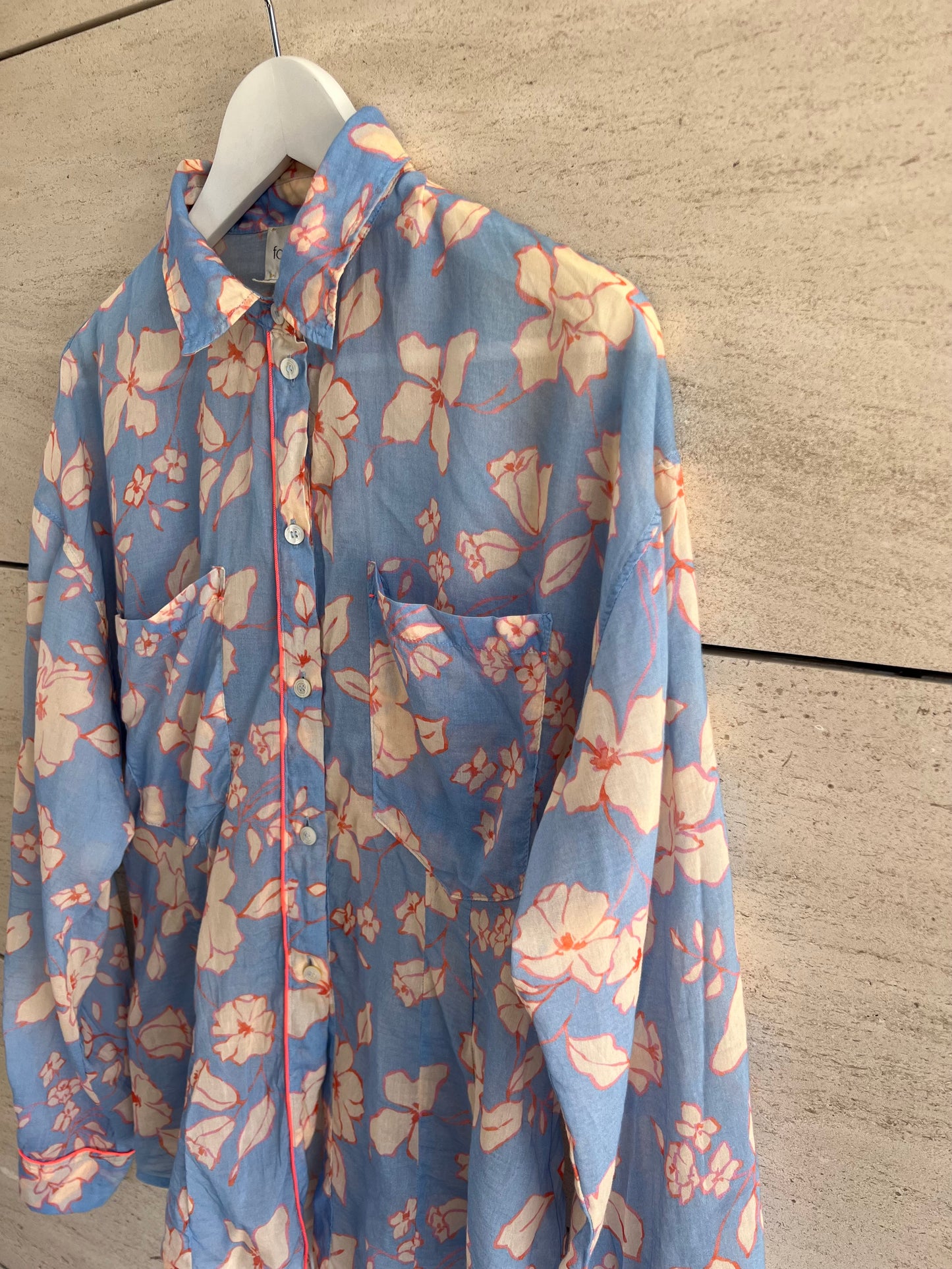 blusa azul con estampado de flores. Espada 56 cm , Largo 69 m