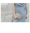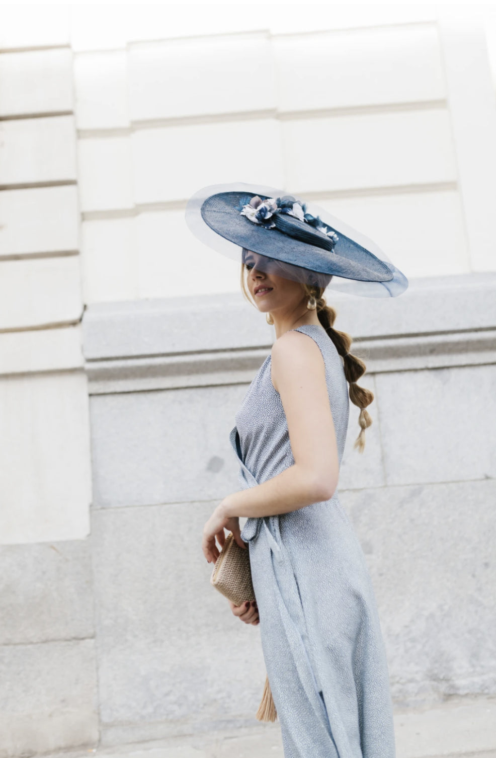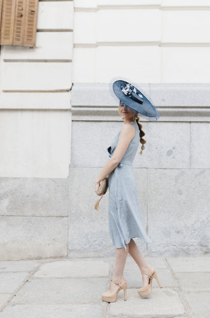 Producto descatalogado. Vestido cruzado de micro lunares azul marino con fondo celeste, con lazada lateral fija en un lado y corchete en la parte interior del vestido.