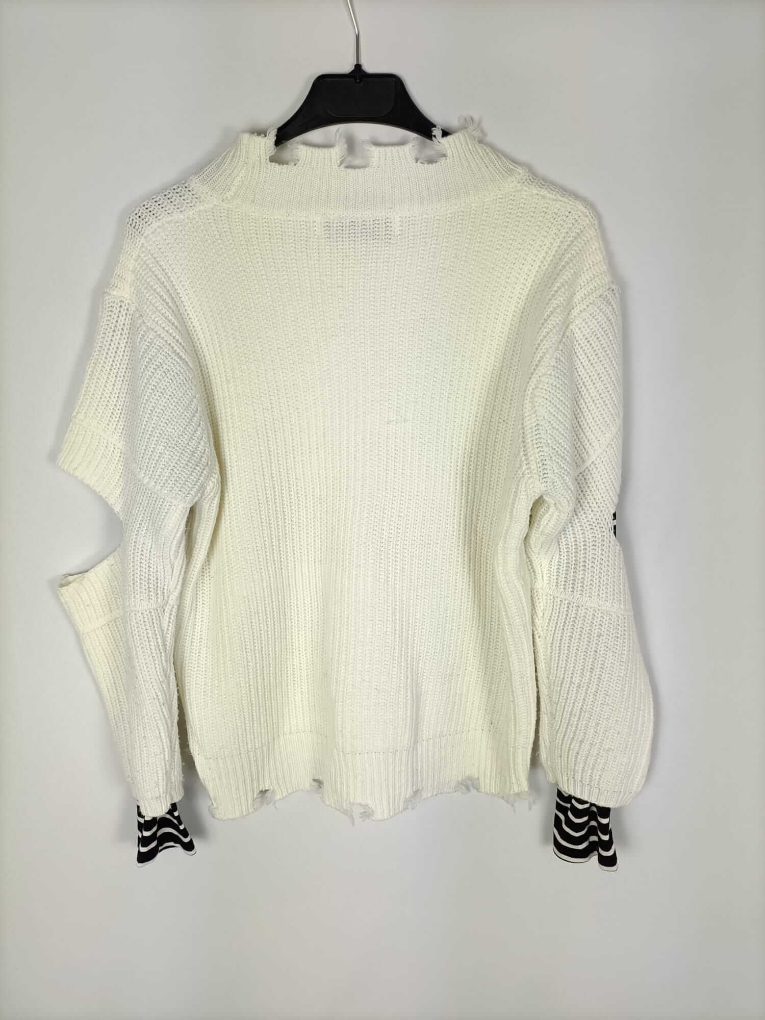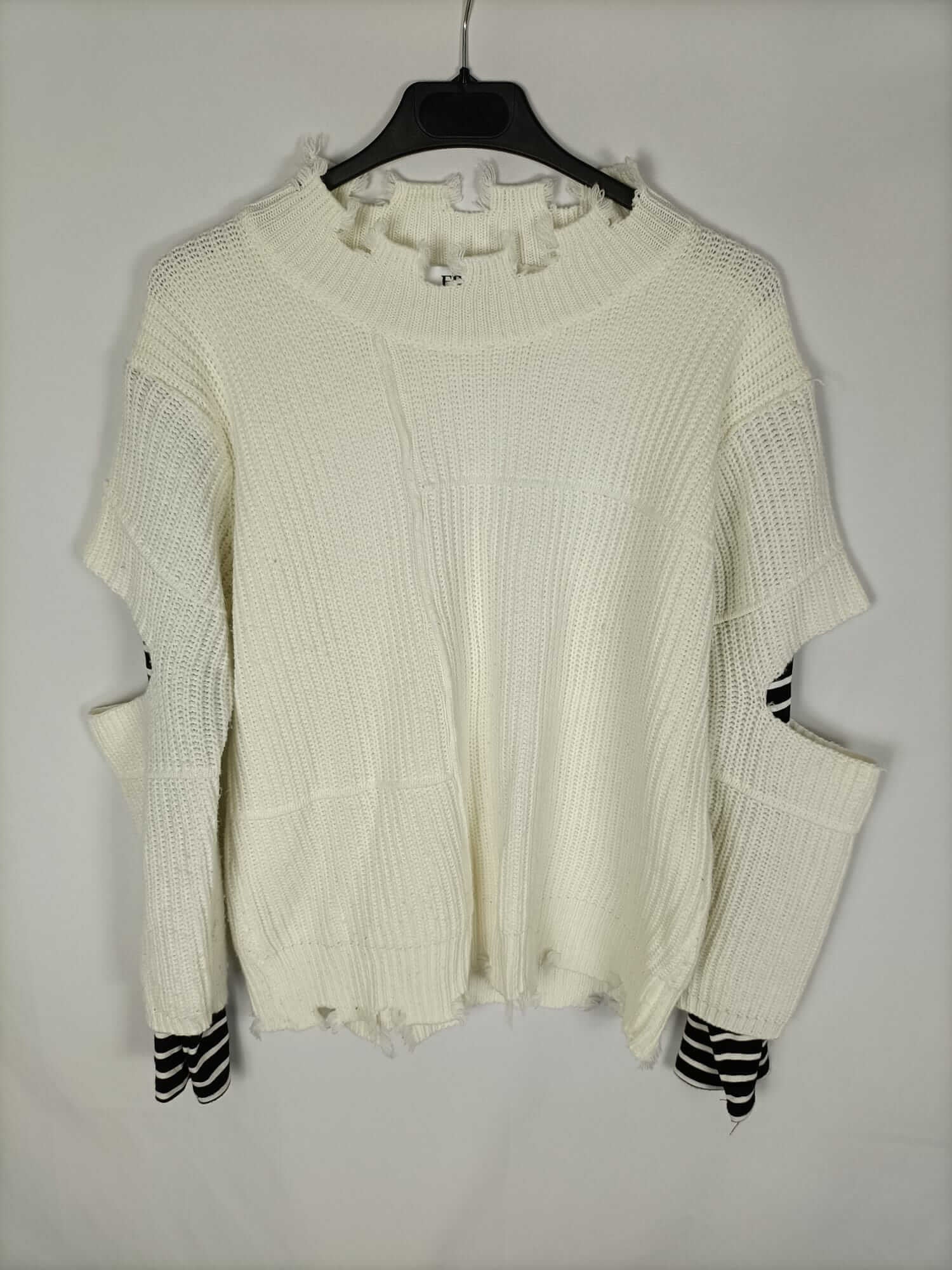 Freya. Tu (s/m). Jersey de punto blanco con detalle de rotos y camiseta en las mangas. Elástico. Largo 64 cm