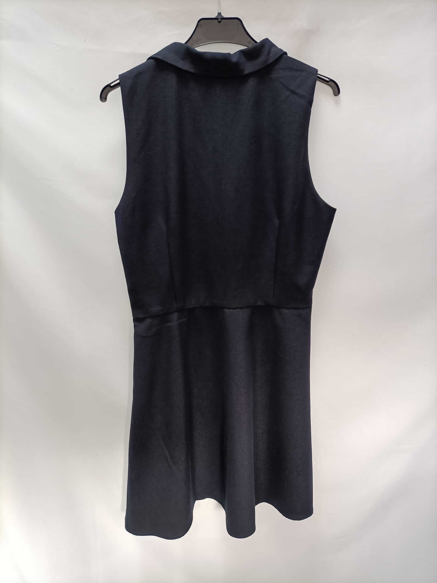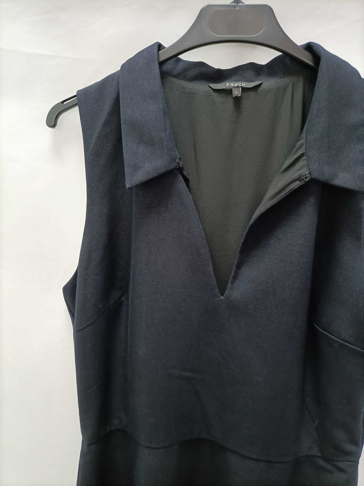 Frnch. L. Vestido azul fluido con cuello. Sin mangas. No elástico. De sisa a sisa 48 cm largo 90 cm