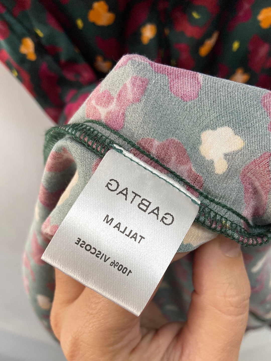 Vestido verde animal print viscosa. Largo asimétrico lazada en el escote largo de 124 cm.