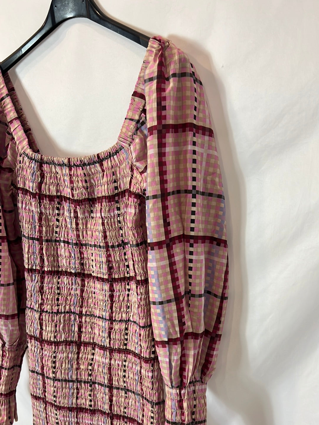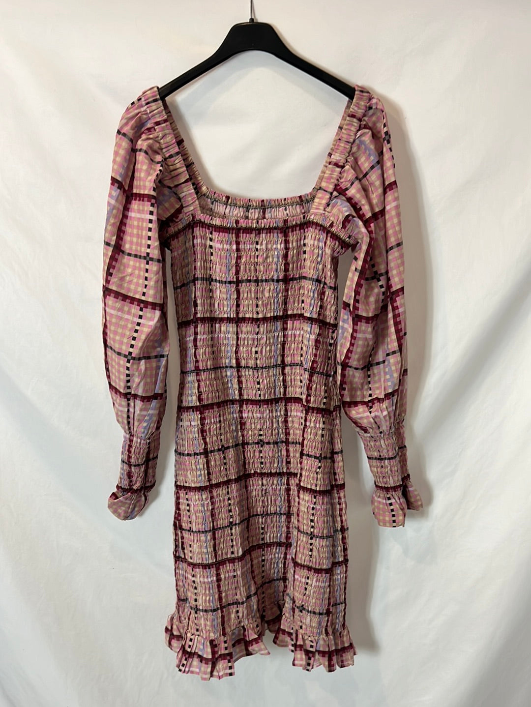 vestido corto estampado de cuadros con cuerpo elástico de nido de abeja. Largo 94cm, elastico