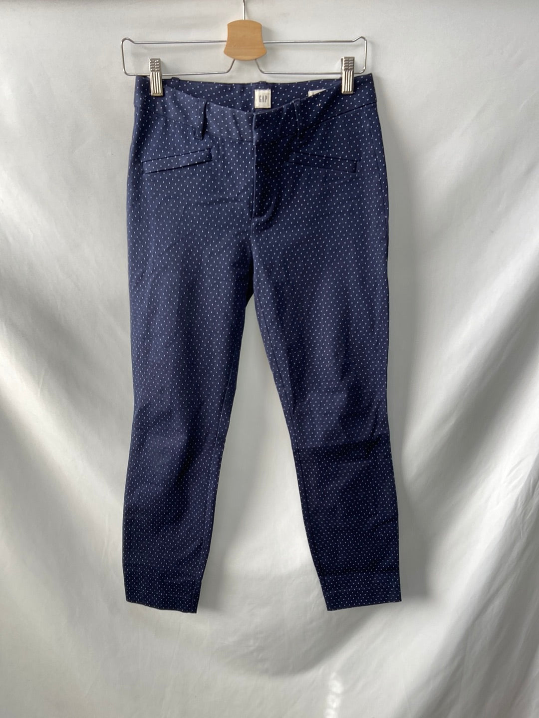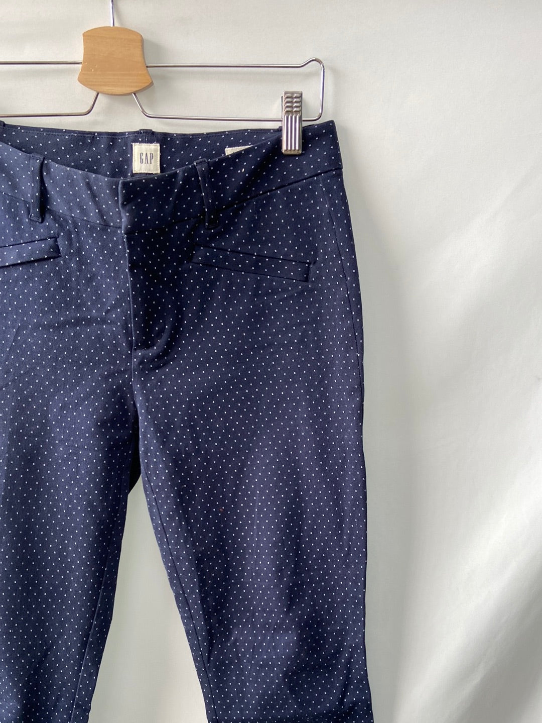 Pantalones azules de vestir con topitos blancos. Bolsillos falsos, son elásticos. Cintura 38 cm largo 90 cm
