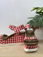 Plataformas de cuadros vichi rojos y blancos. Atadas al tobillo. Tacón 10 cm, Plataforma 5 cm