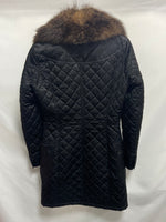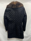 Abrigo acolchado negro con botones y cuello pelo sintético. Entallado. De sisa a sisa 45’cm largo 85 cm.