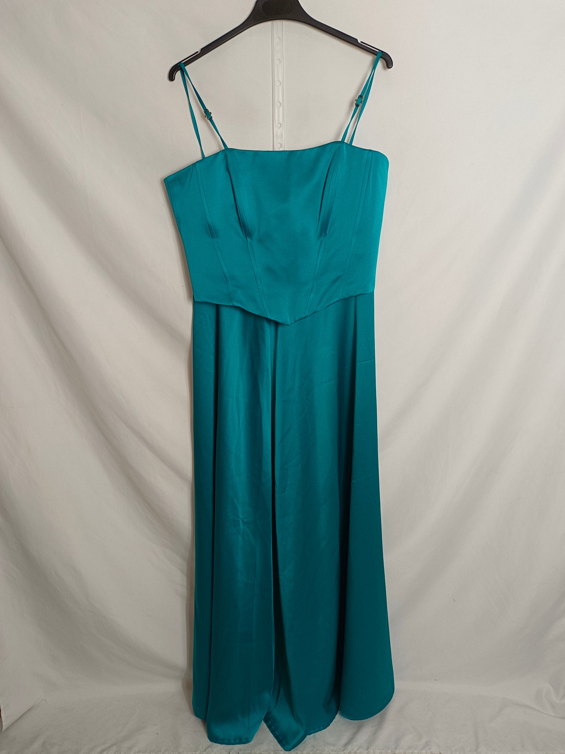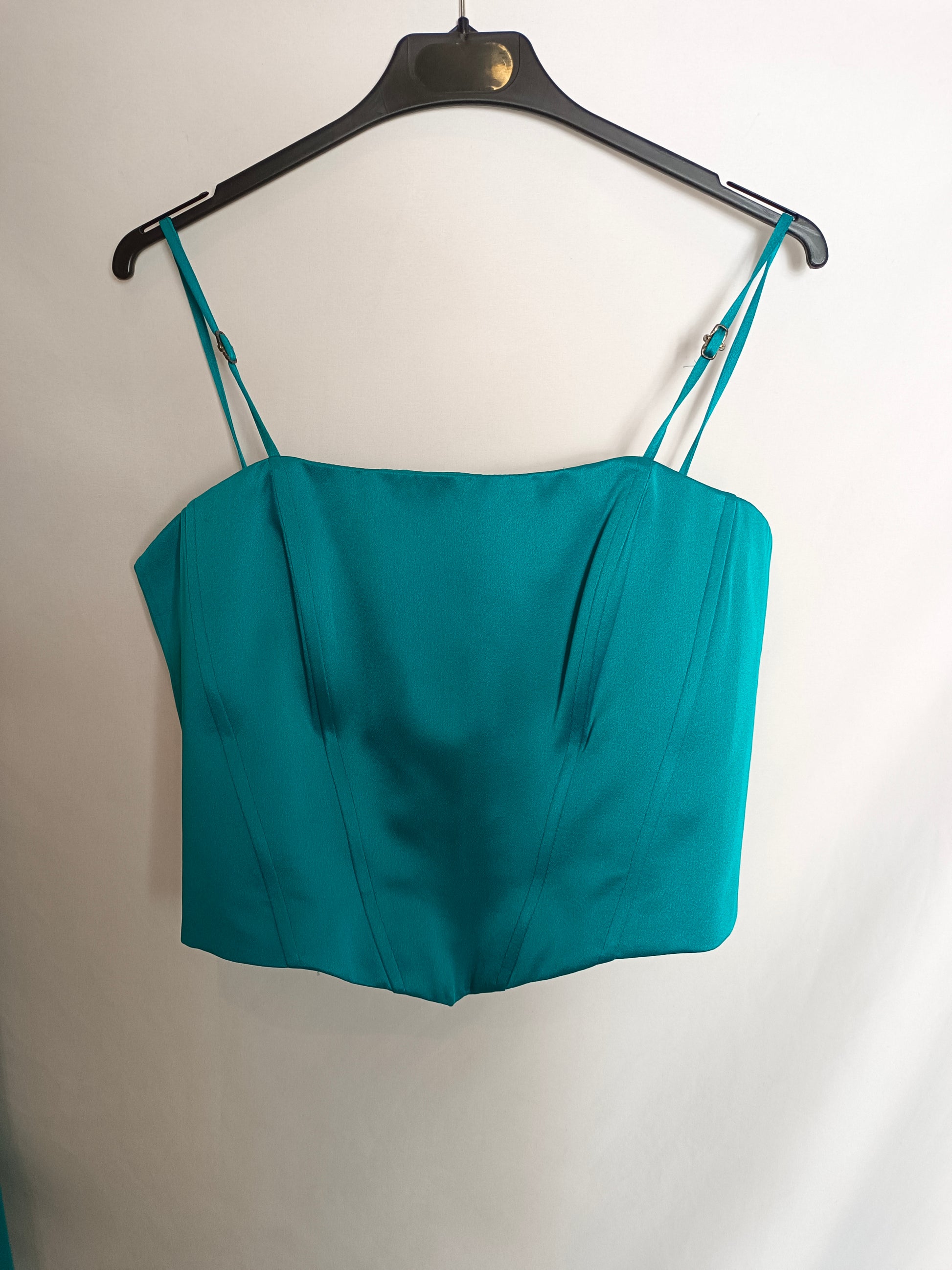 Conjunto 2 piezas falda y top azul satinado turquesa .Tejido semi elástico. Top con ballenas |