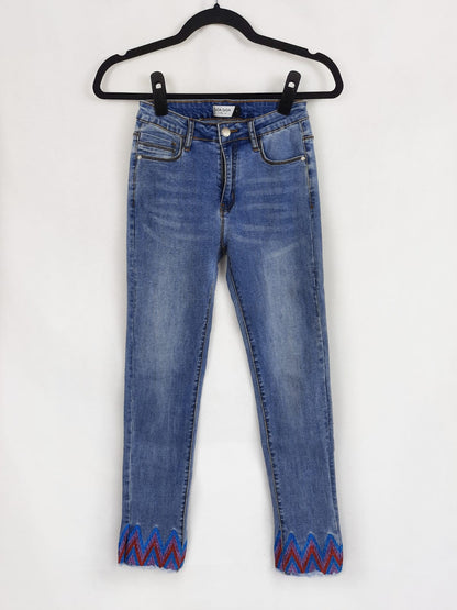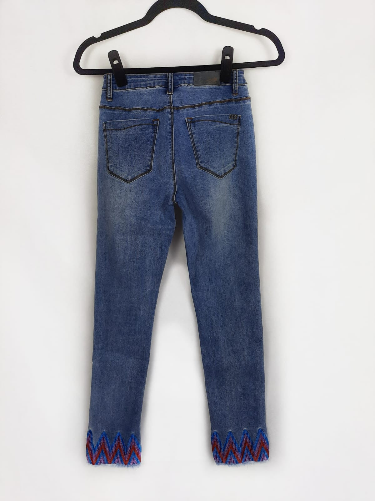 Pantalones pitillo vaquero con detalles étnicos en los tobillos. Es muy elástica. Cintura 30 cm, largo 92 cm