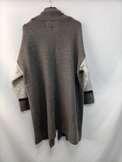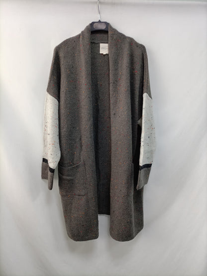cárdigan gris con detalle de hilos de colores. largo 83 cm