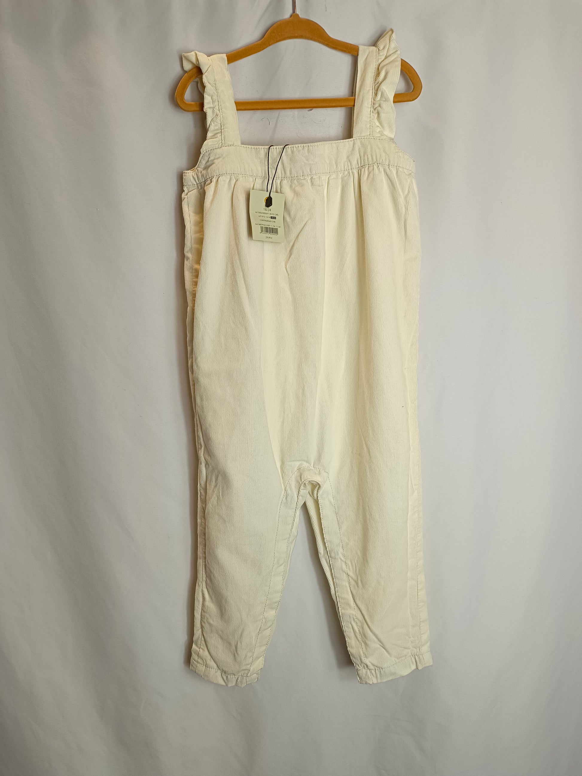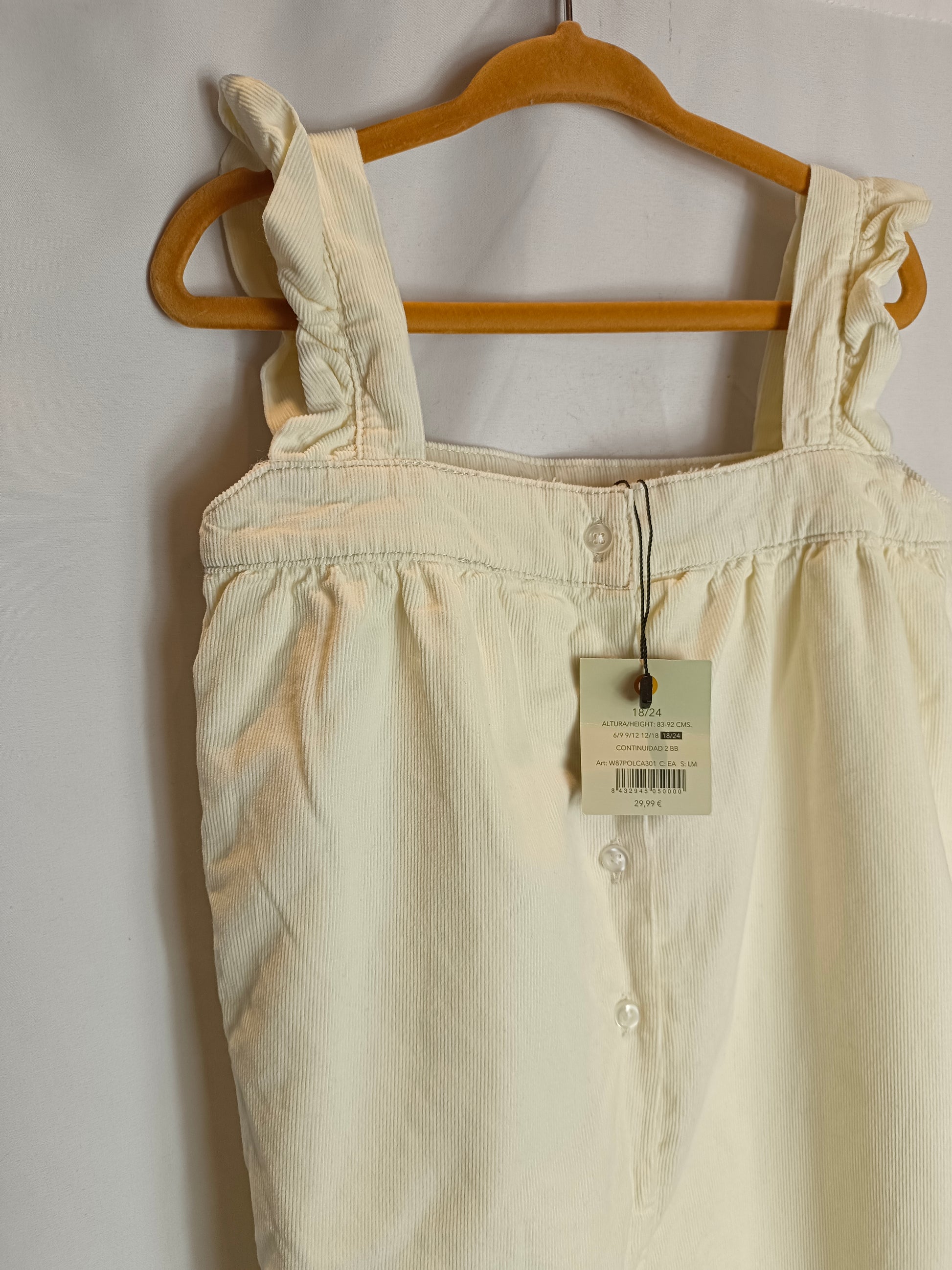 NUEVO CON ETIQUETA. Peto beige clarito de pana abotonada por la espalda y con botones de clips entre las piernas. Largo 77 cm de sisa a sisa 30 cm