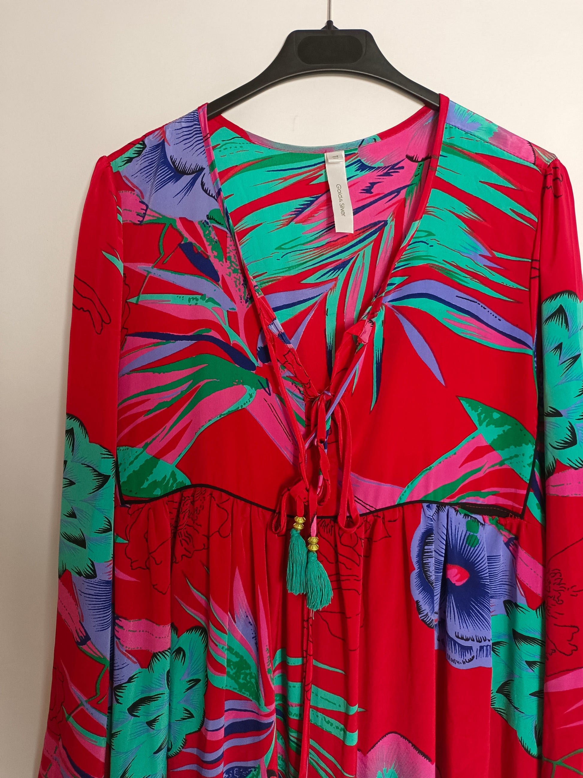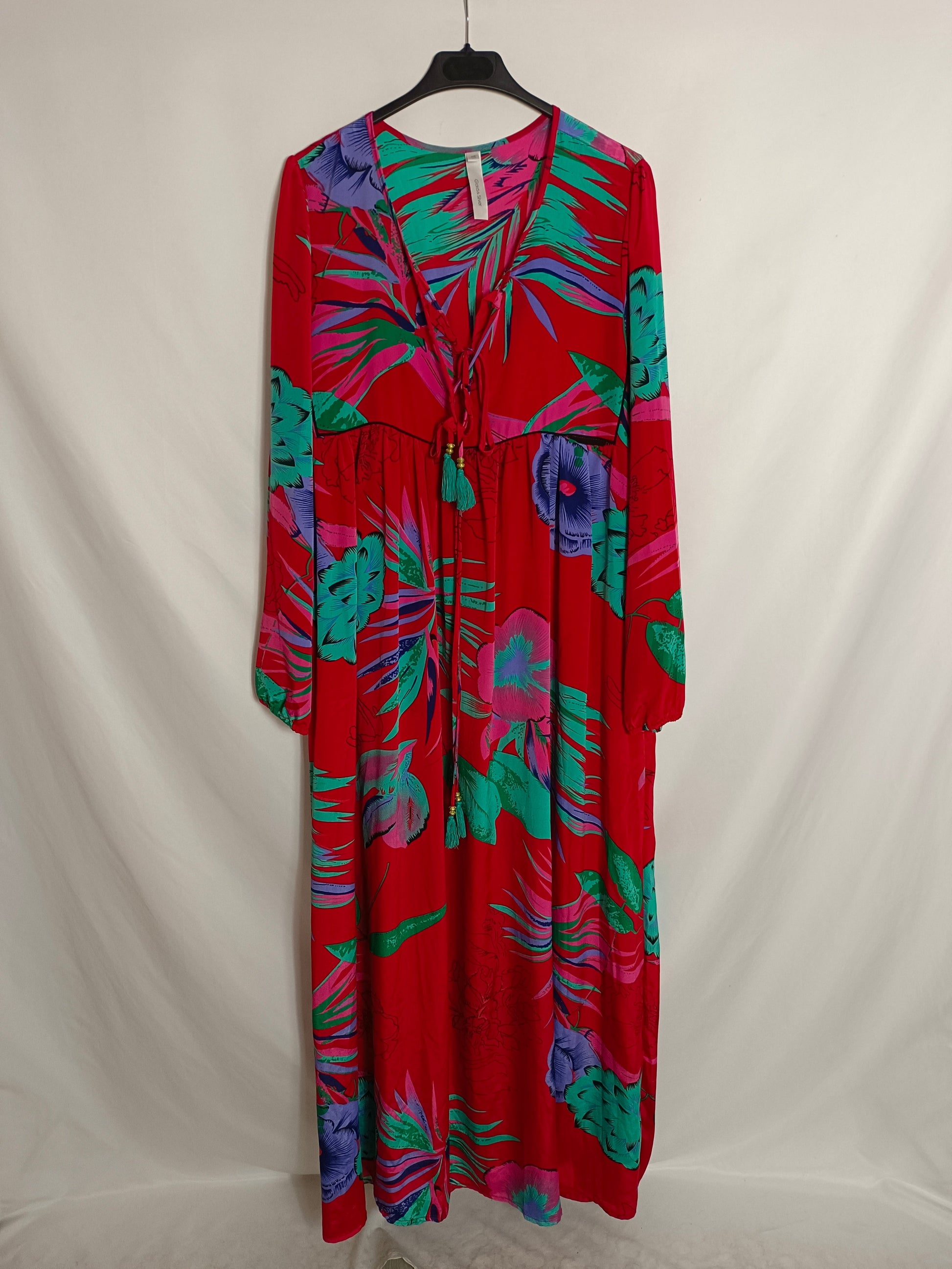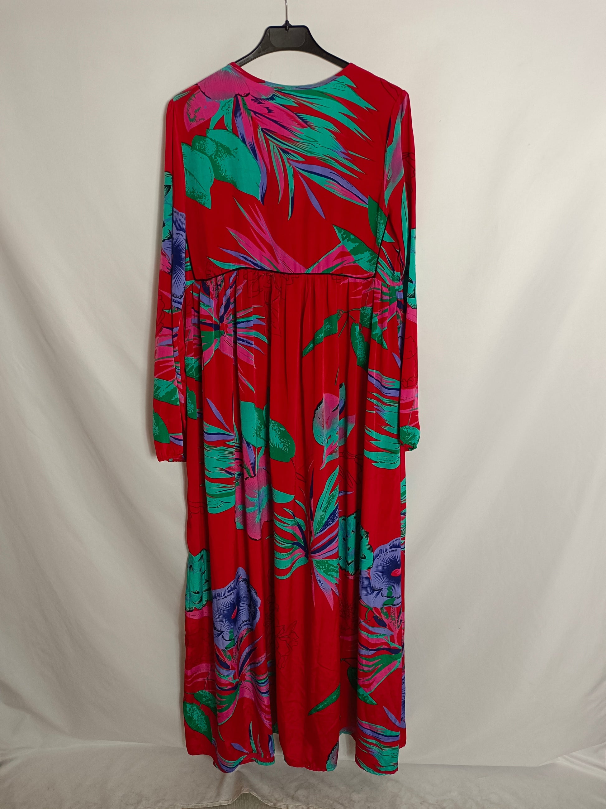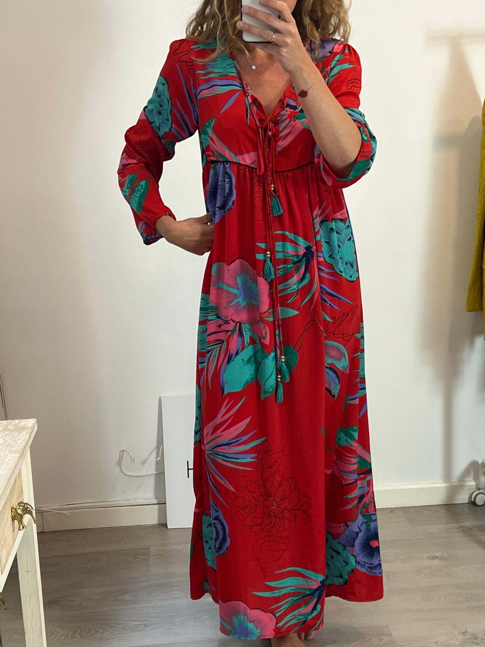 vestido largo rojo fluido con estampado de flores. Ajustable en el pecho