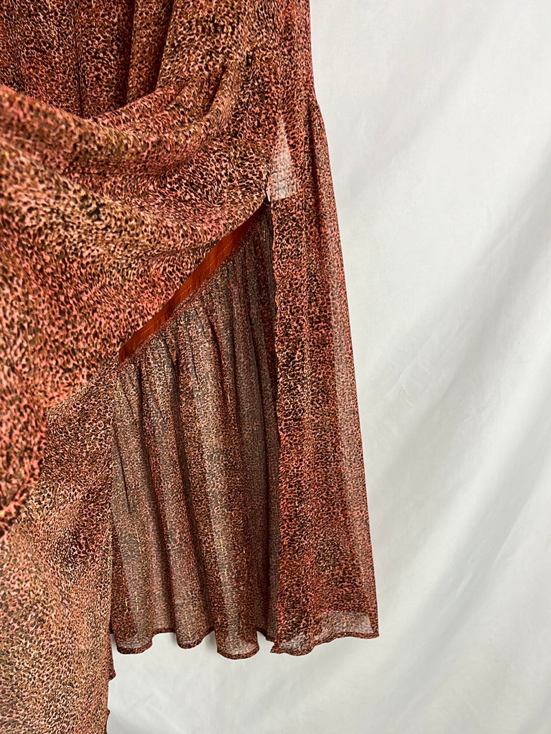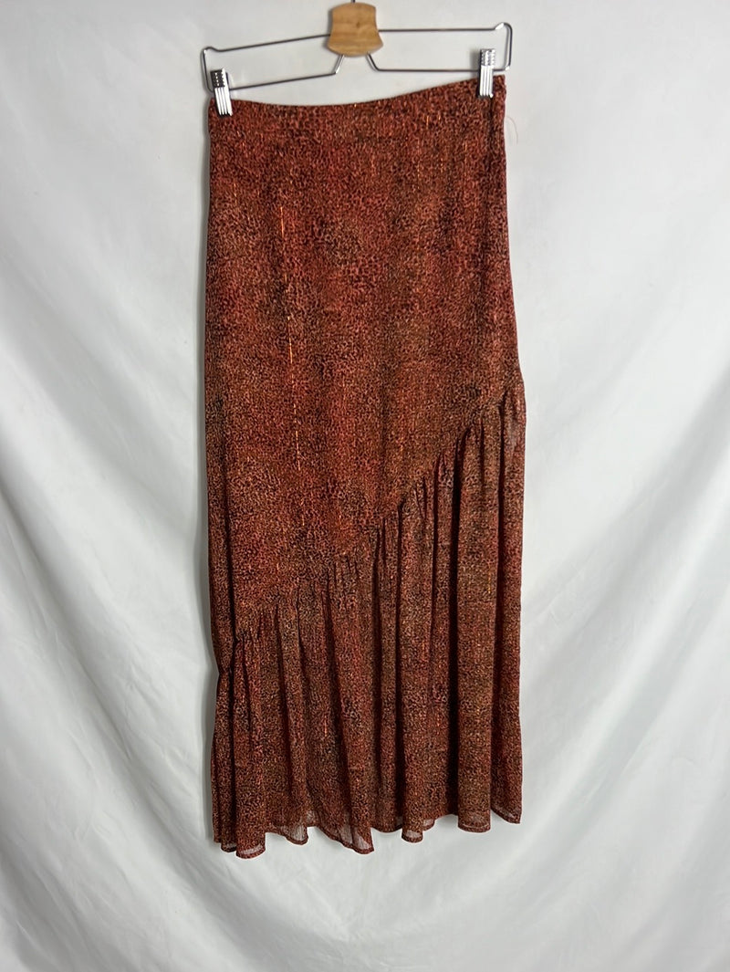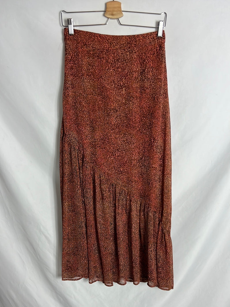 Falda larga estampada hilos dorados. Cremallera lateral . Parte del volante semitransparente. Cintura 35cm y largo 97cm