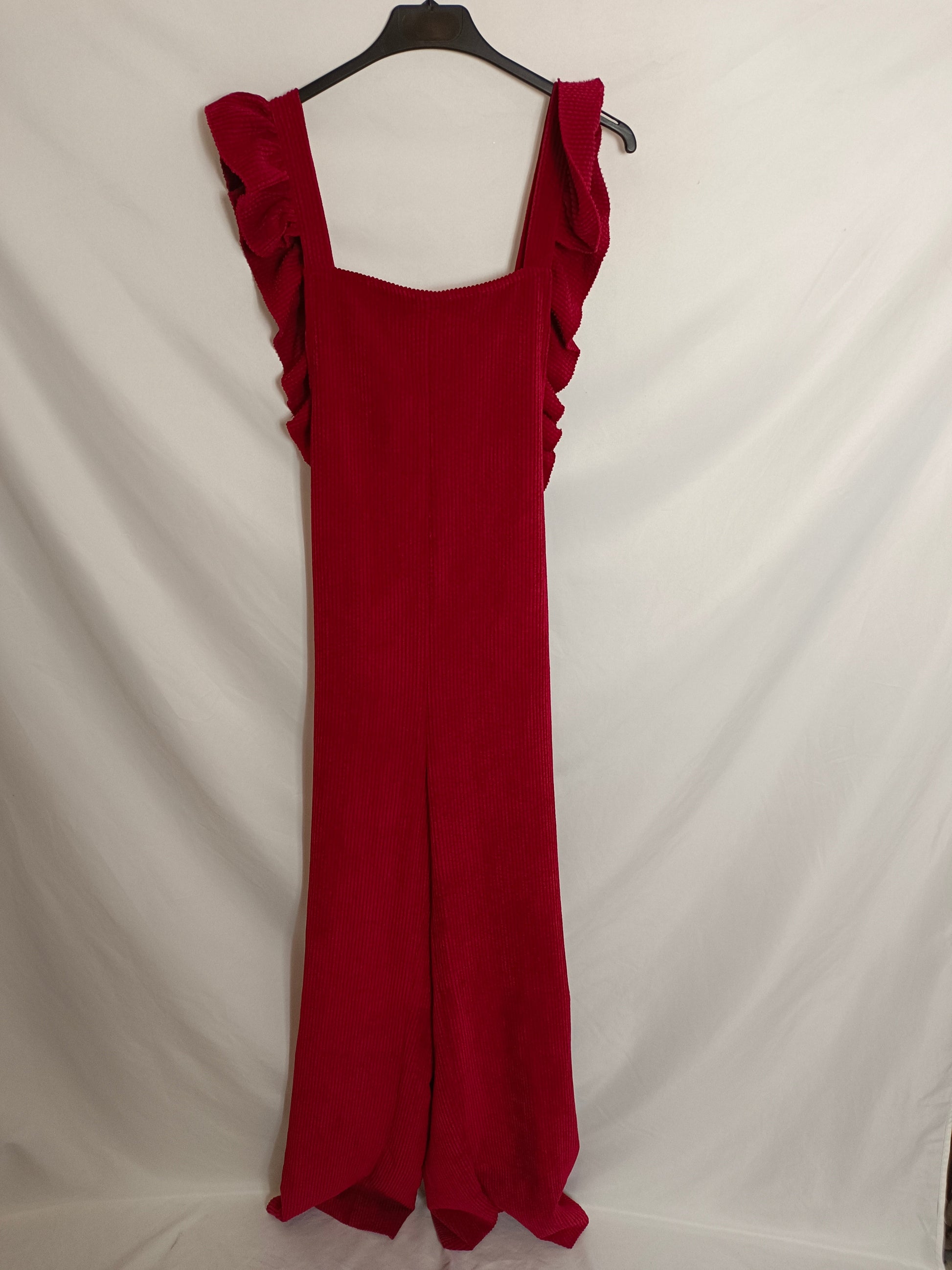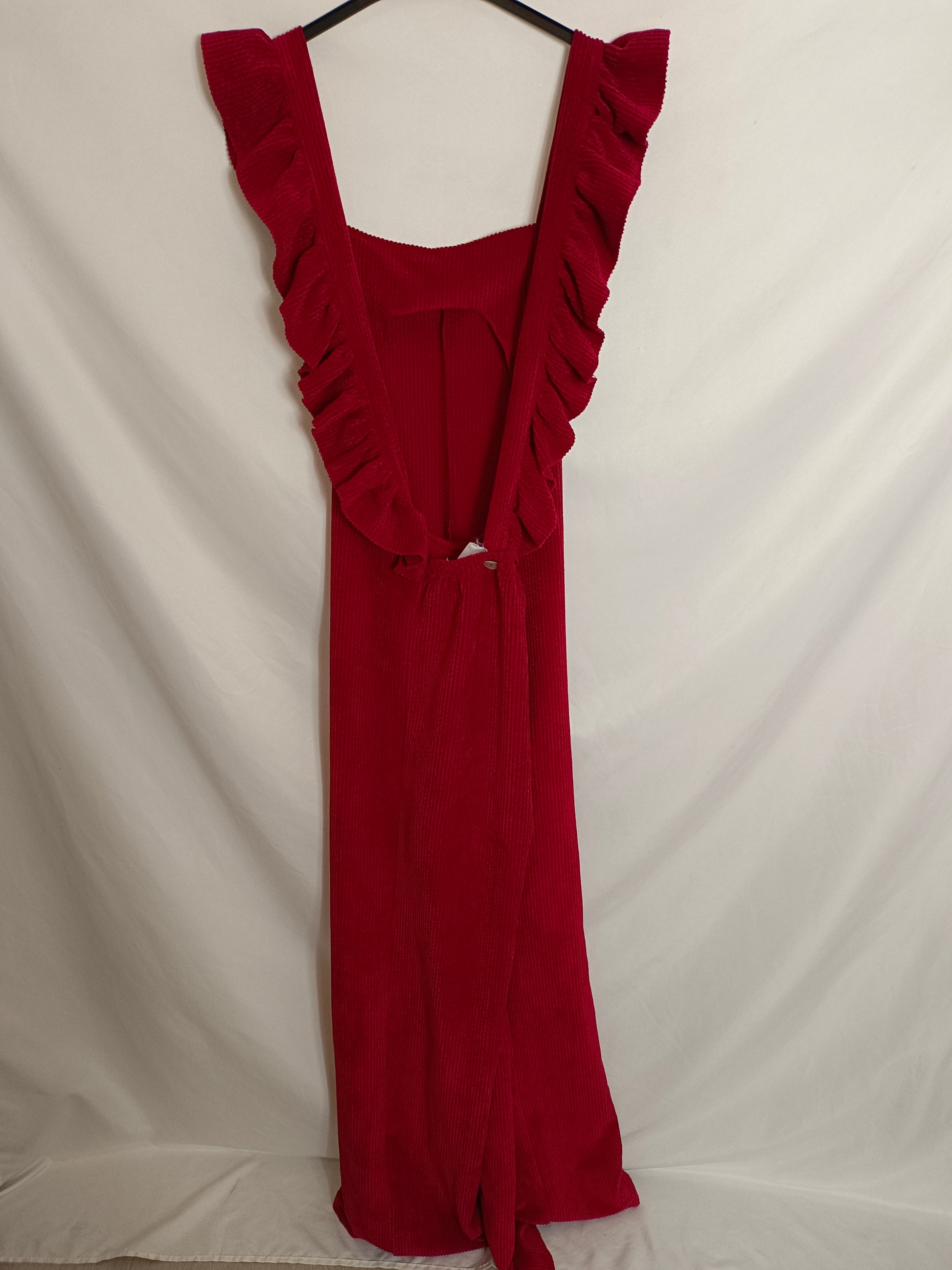 Peto largo de pana burdeos de pata ancha. Tirante con volante.