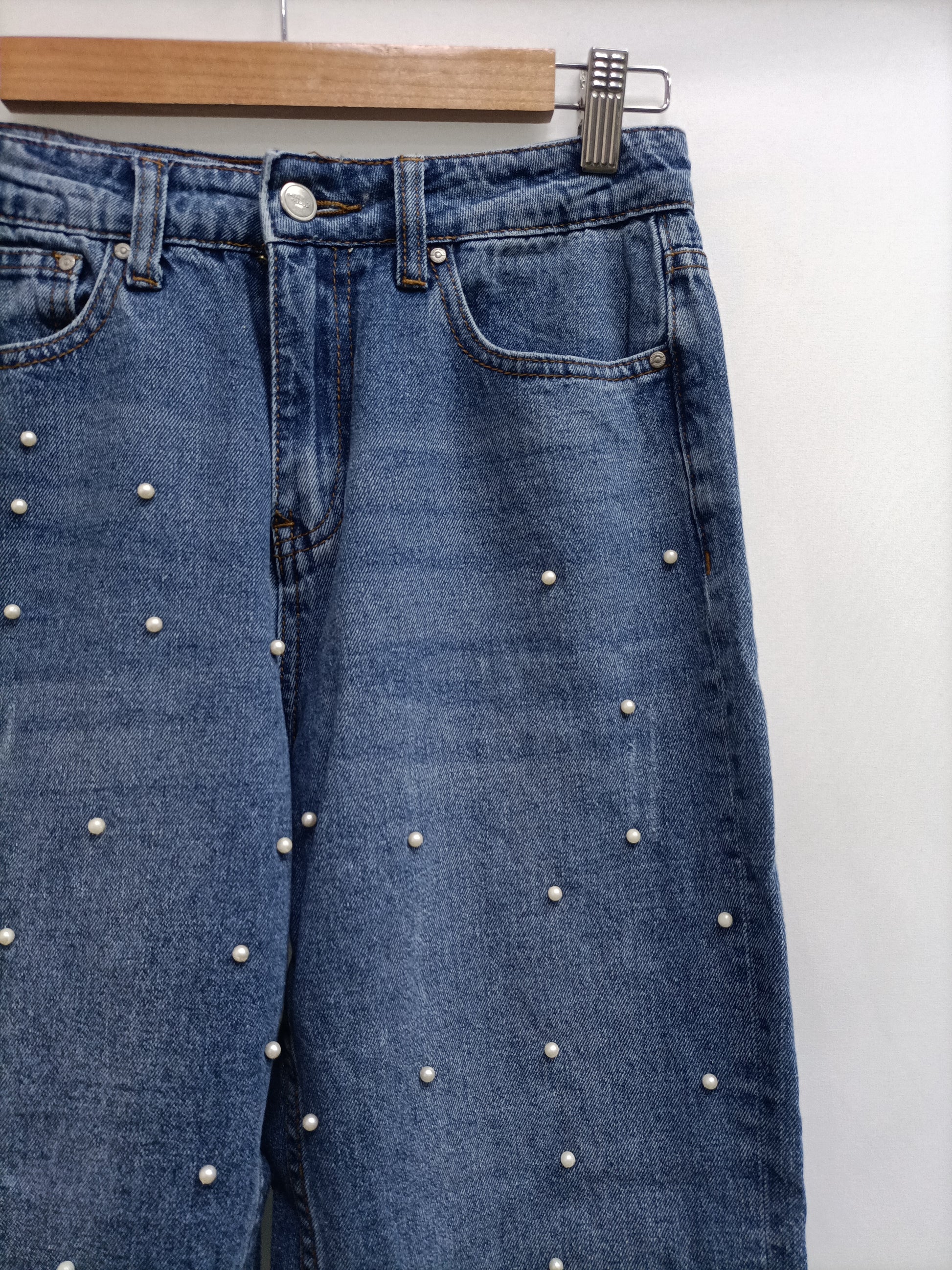 Pantalón denim estilo monfit con perlas. Cintura 36 cm largo 94 cm