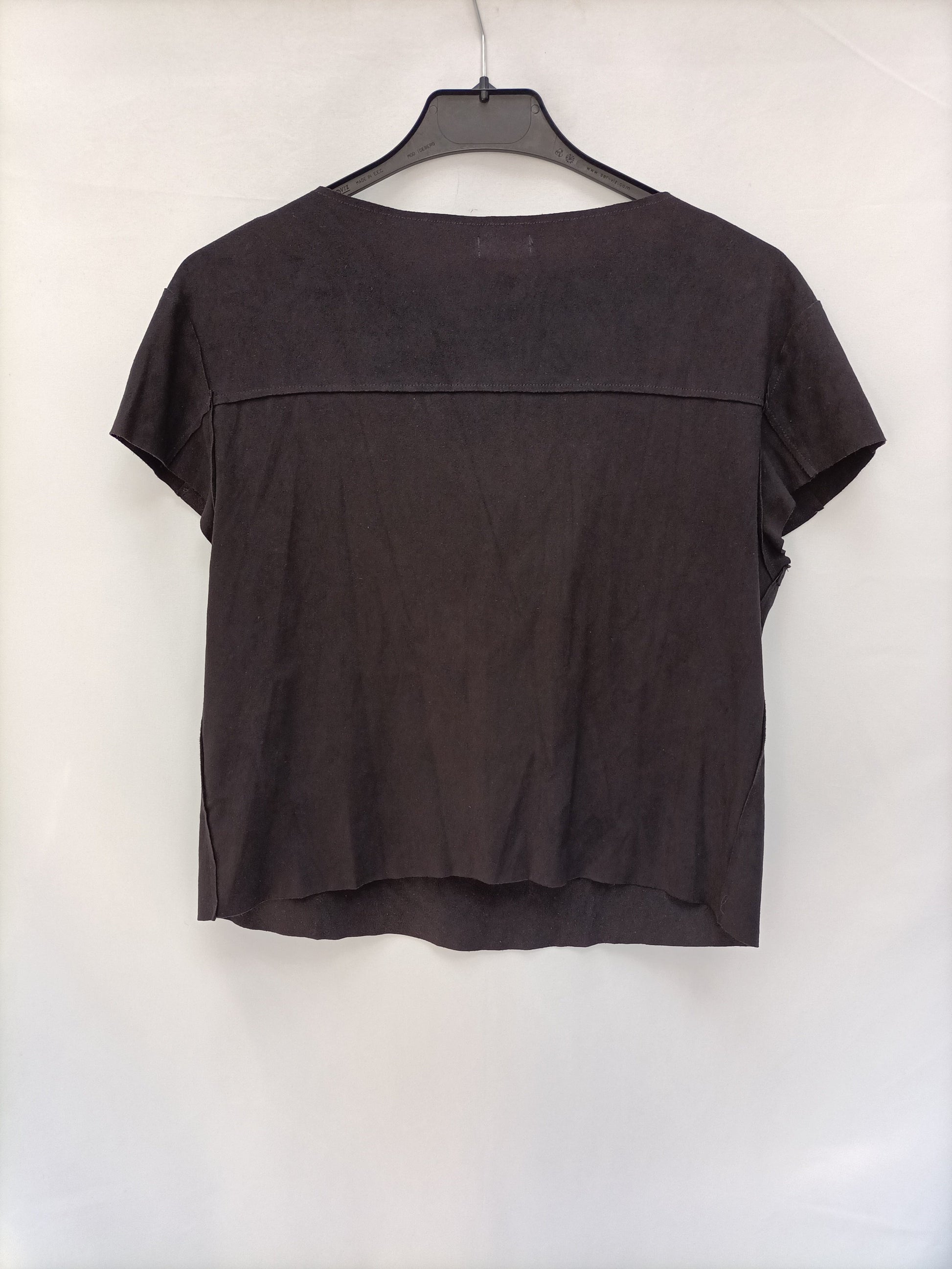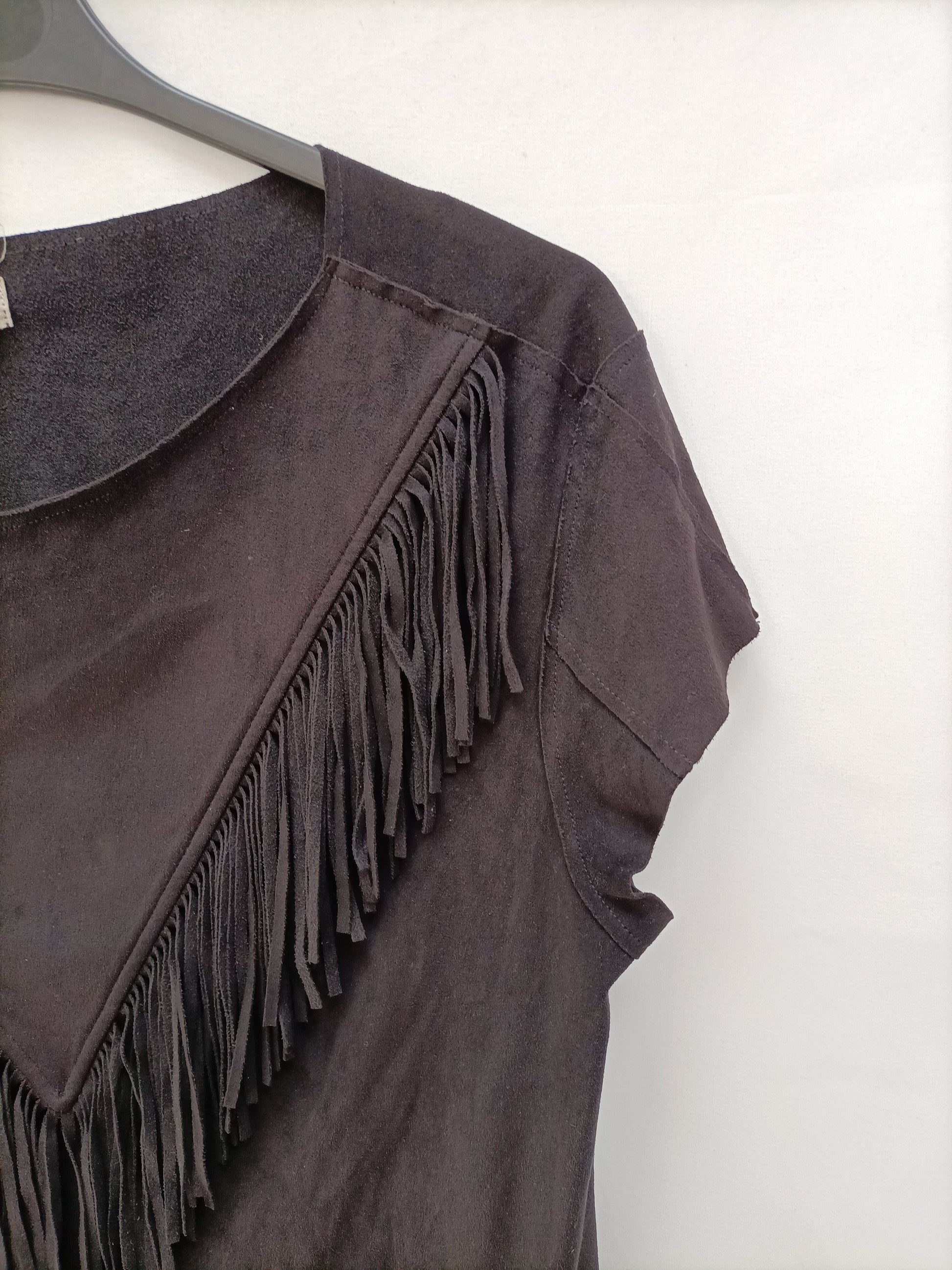 Top negro de antelina con detalle de flecos. Elastica. largo 46 cm