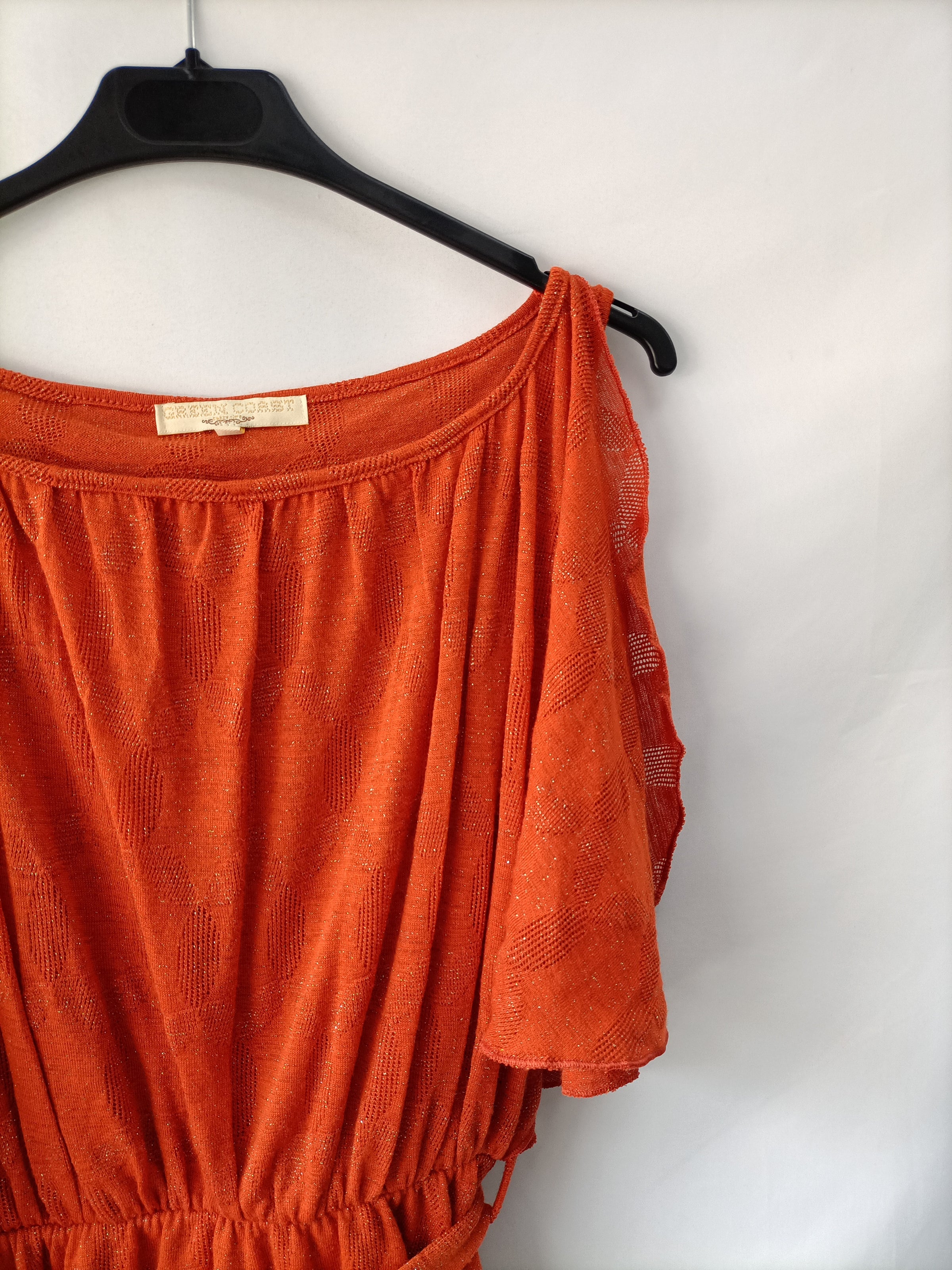 Vestido con toque brillante naranja con hombros descubiertos y mangas fluidas, corte elástico en la cintura con lazada incorporada. Largo 81 cm