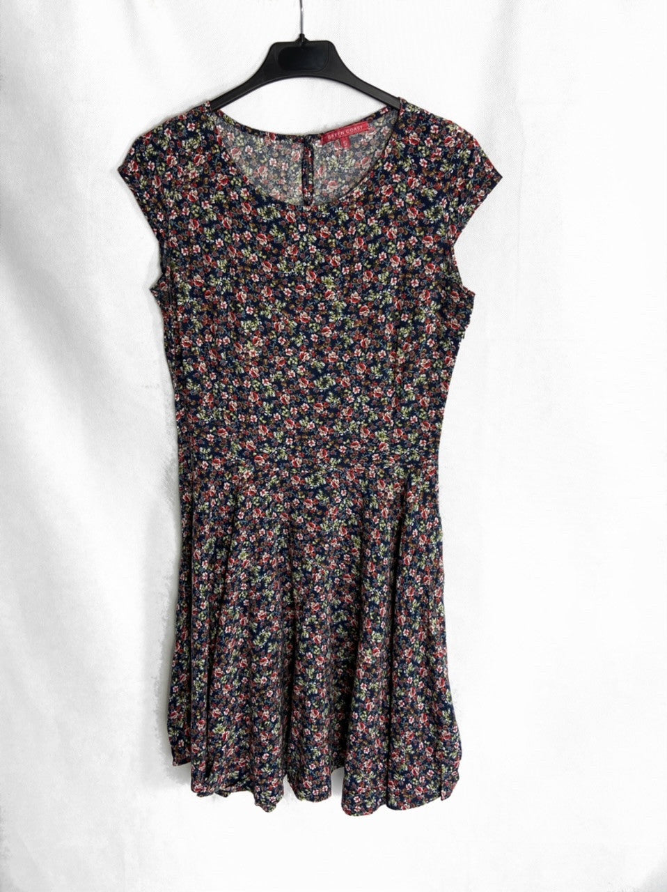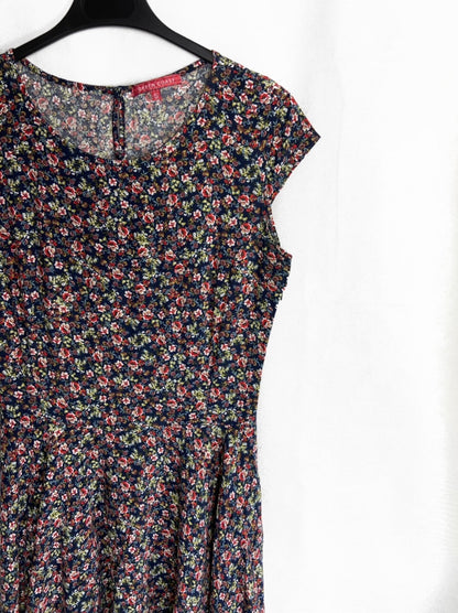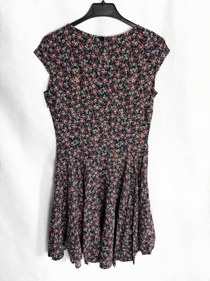 Vestido corto azul con florecitas pequeñas, corte en la cintura y falda con vuelo, no es elástico y tiene cremallera lateral. De sisa a sisa 47 cm, Largo 87 cm