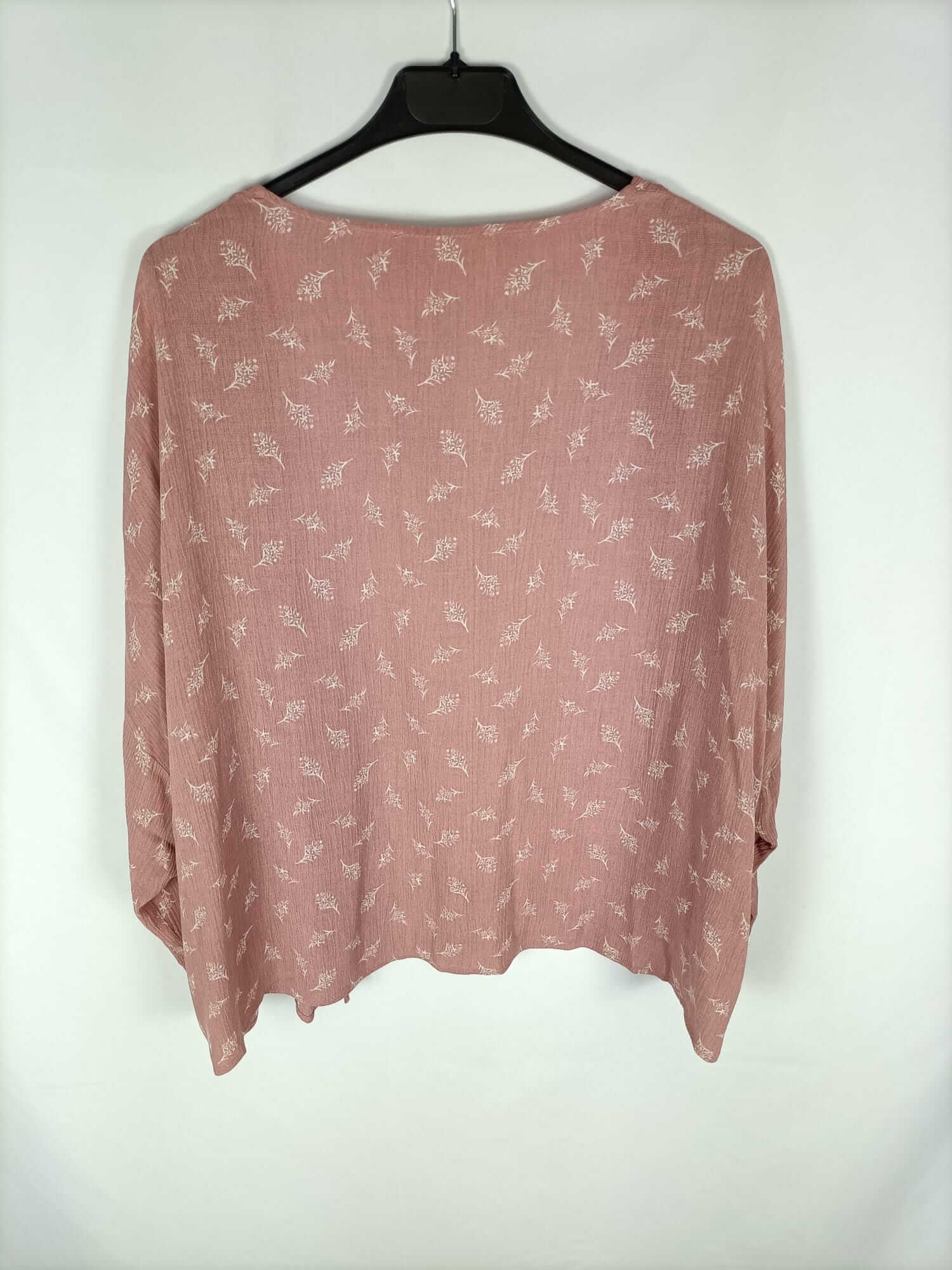 Green coast. S. Kimono rosa con estampado de ramitas en blanco. Fluido con las mangas anchas. No se abrocha. Largo 58 cm