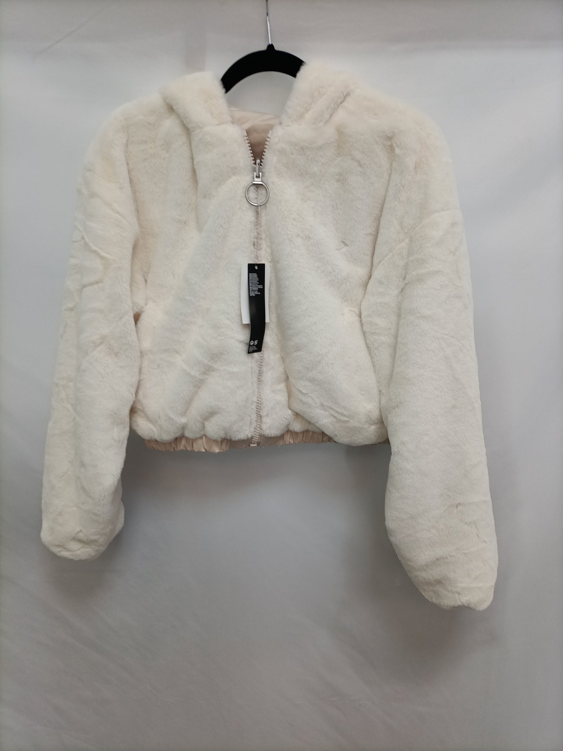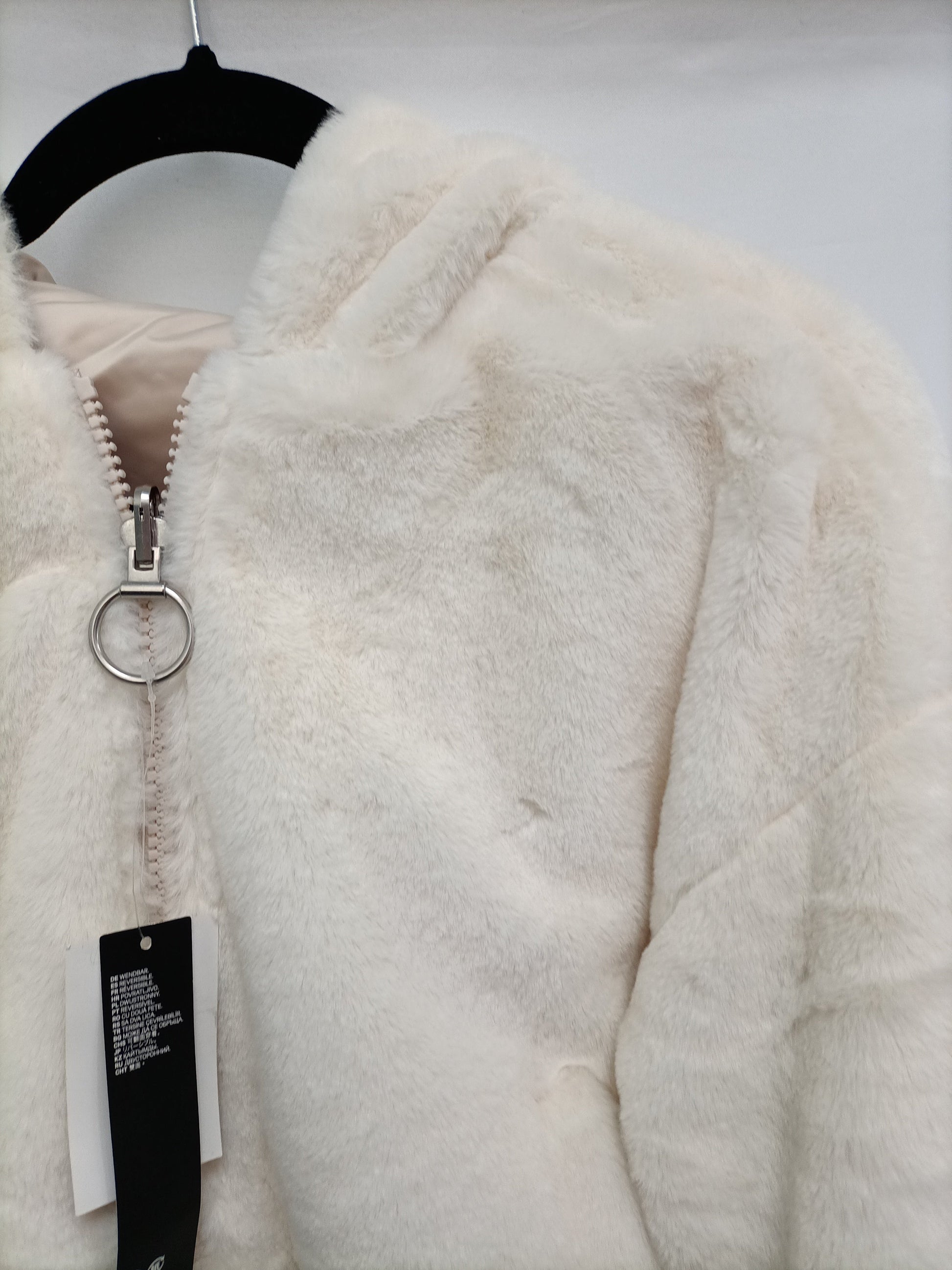 NUEVO CON ETIQUETA. Abrigo cortito de pelito y tejido impermeable reversible. Cintura elástica. De sisa a sisa 53 cm largo 48 cm