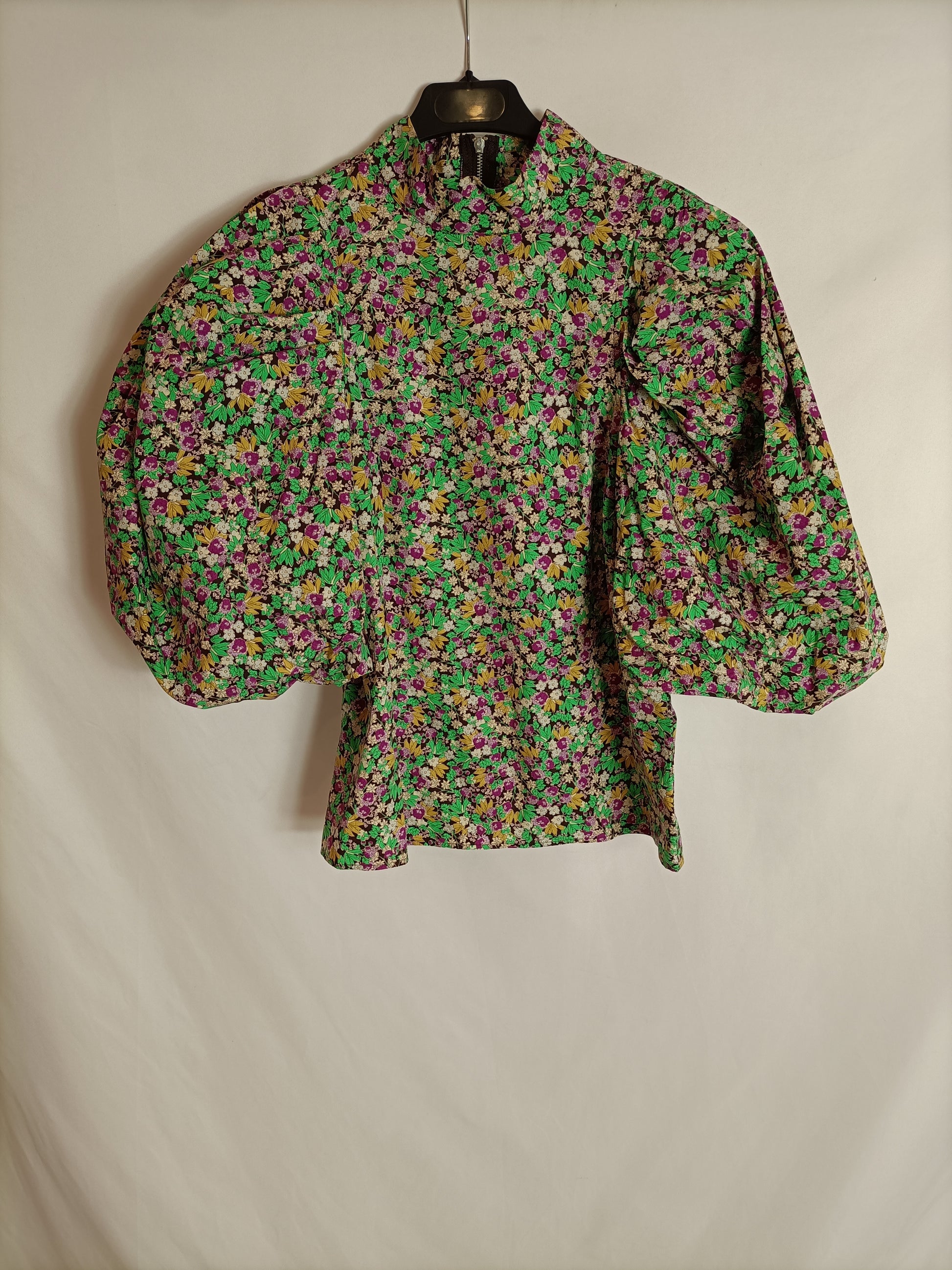 Blusa de flores verdes y moradas con el cuello tortura y las mangas abullonadas.