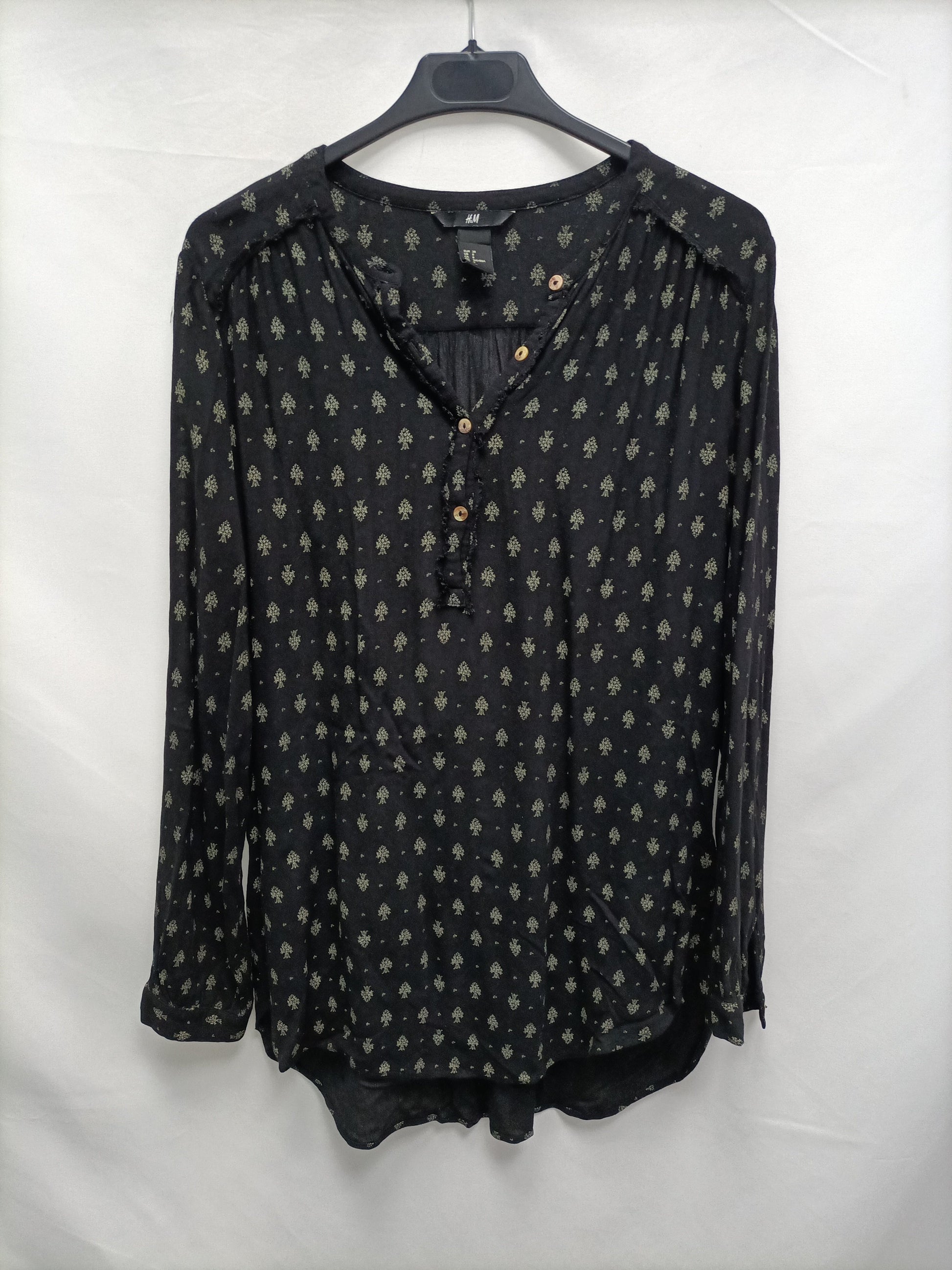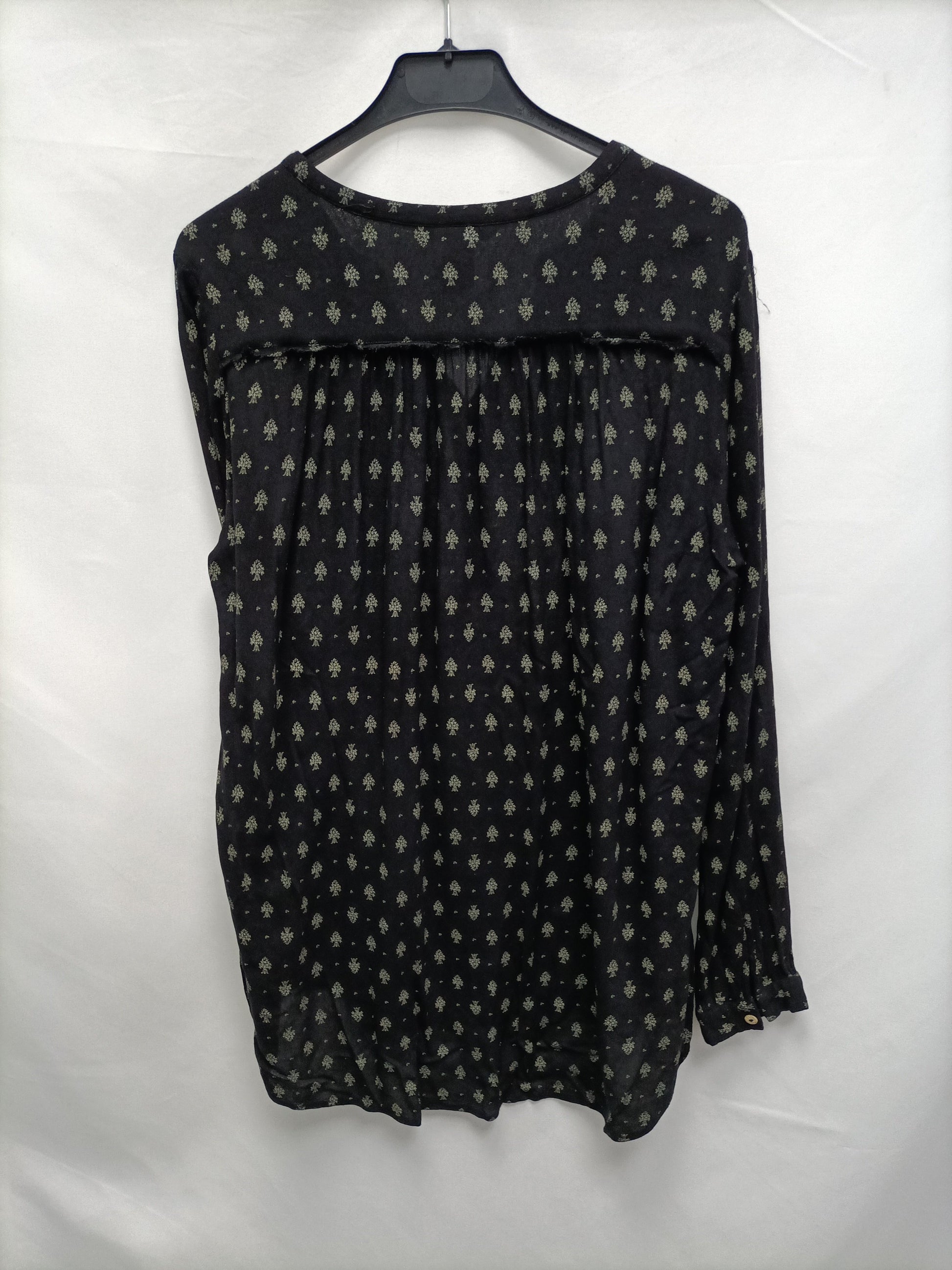 Blusa negra con estampado de arbolitos en beige. No elástica. De sisa a sisa 54 cm Largo 71 cm.