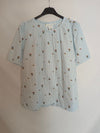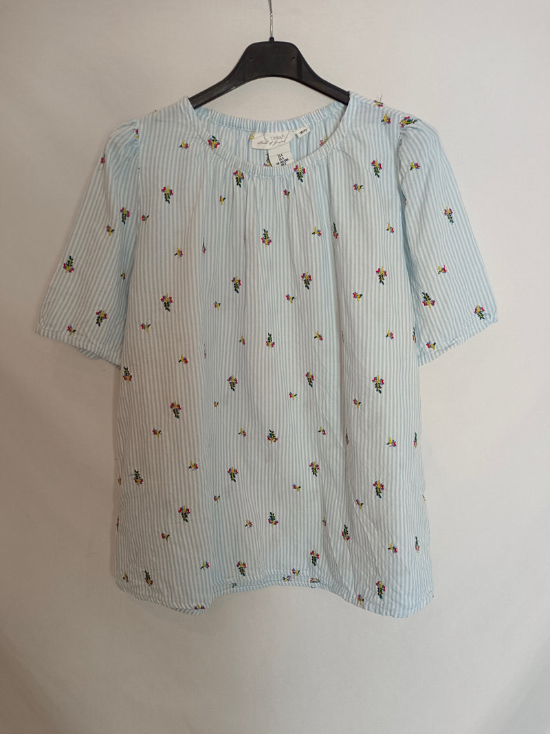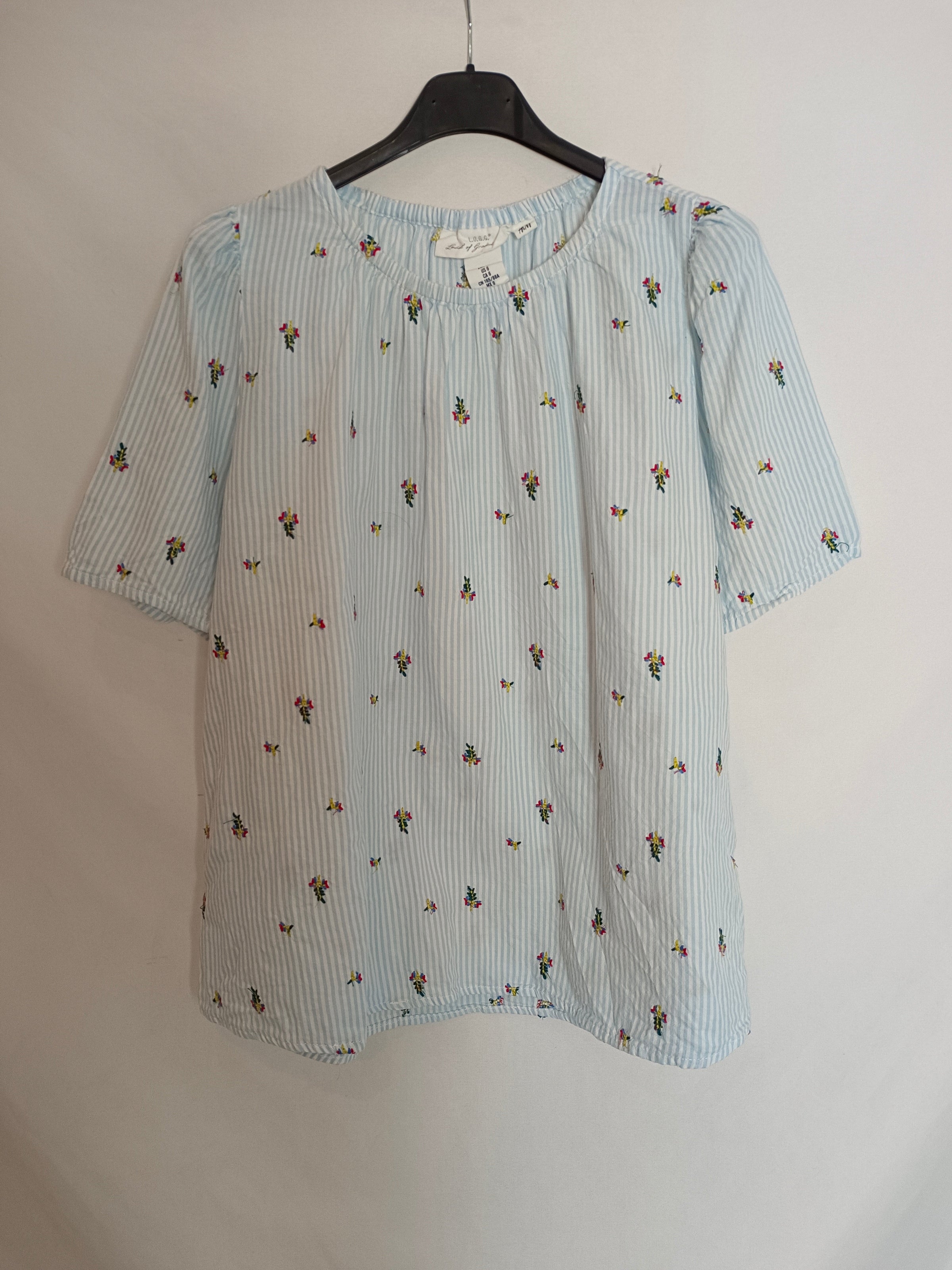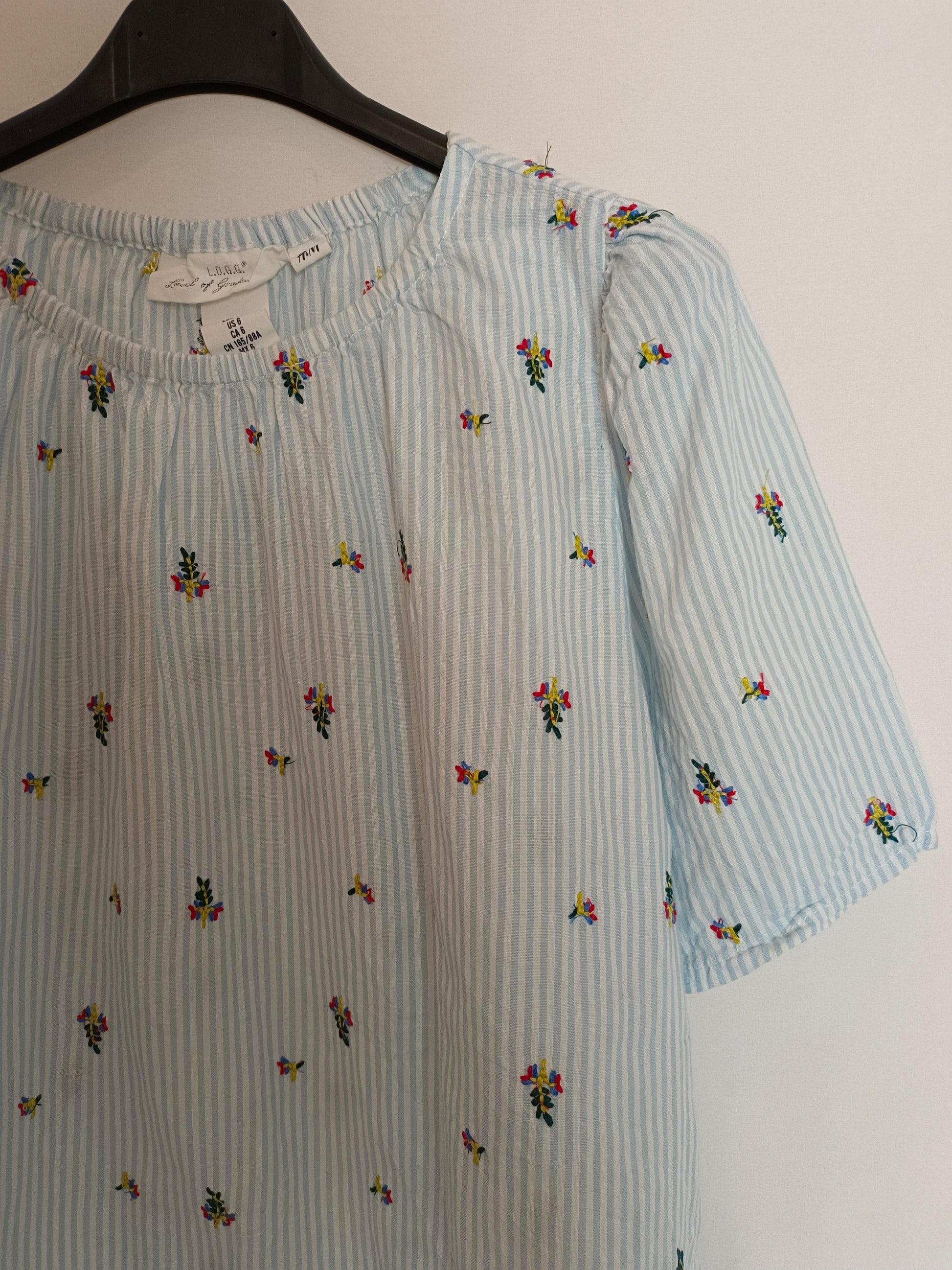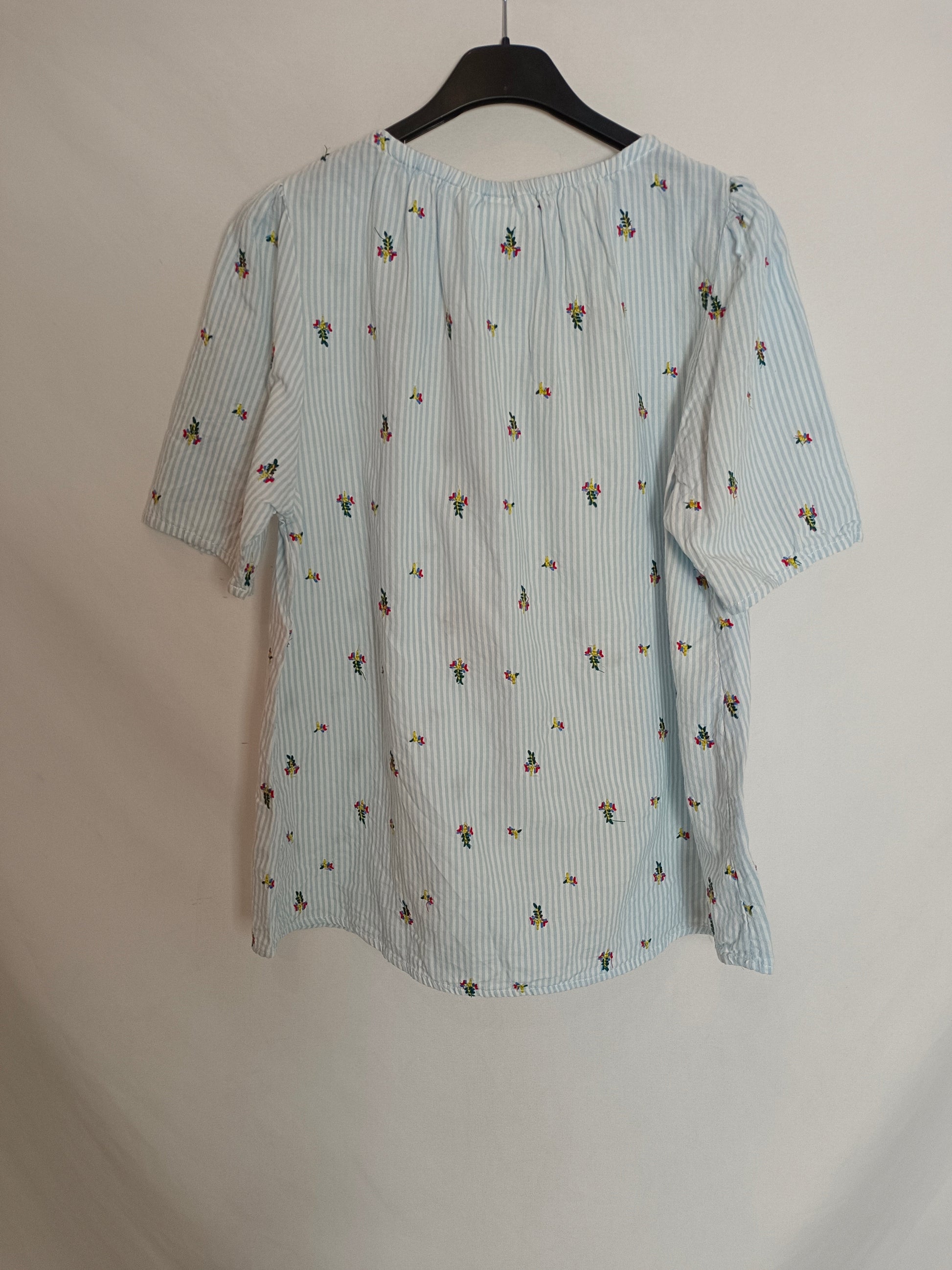 blusa azul y blanca de rayas con flores bordadas y cuello barco elástico.