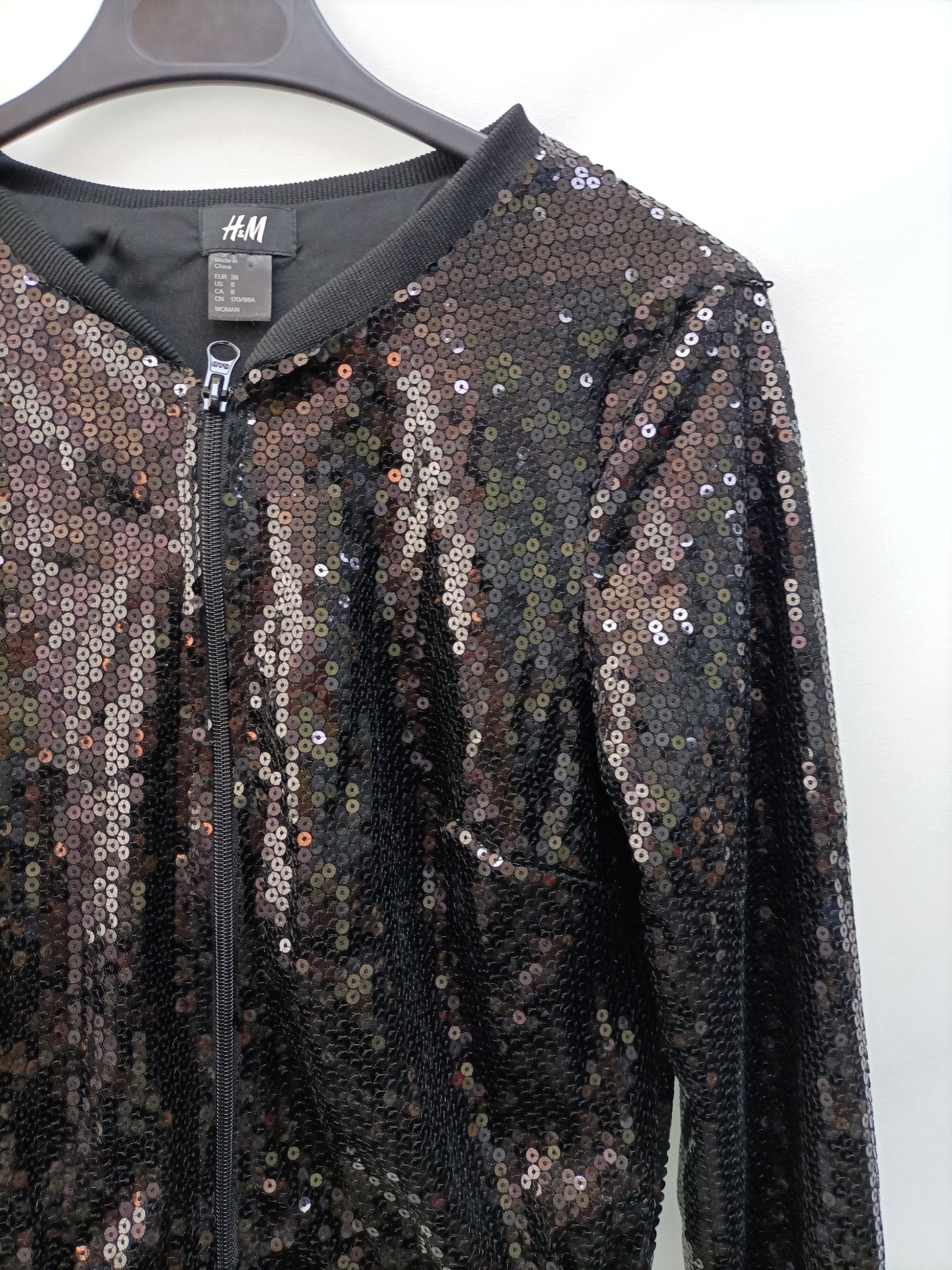 Bomber cortita estilo crop de lentejuelas negras. De sisa a sisa 42 cm largo 43 cm