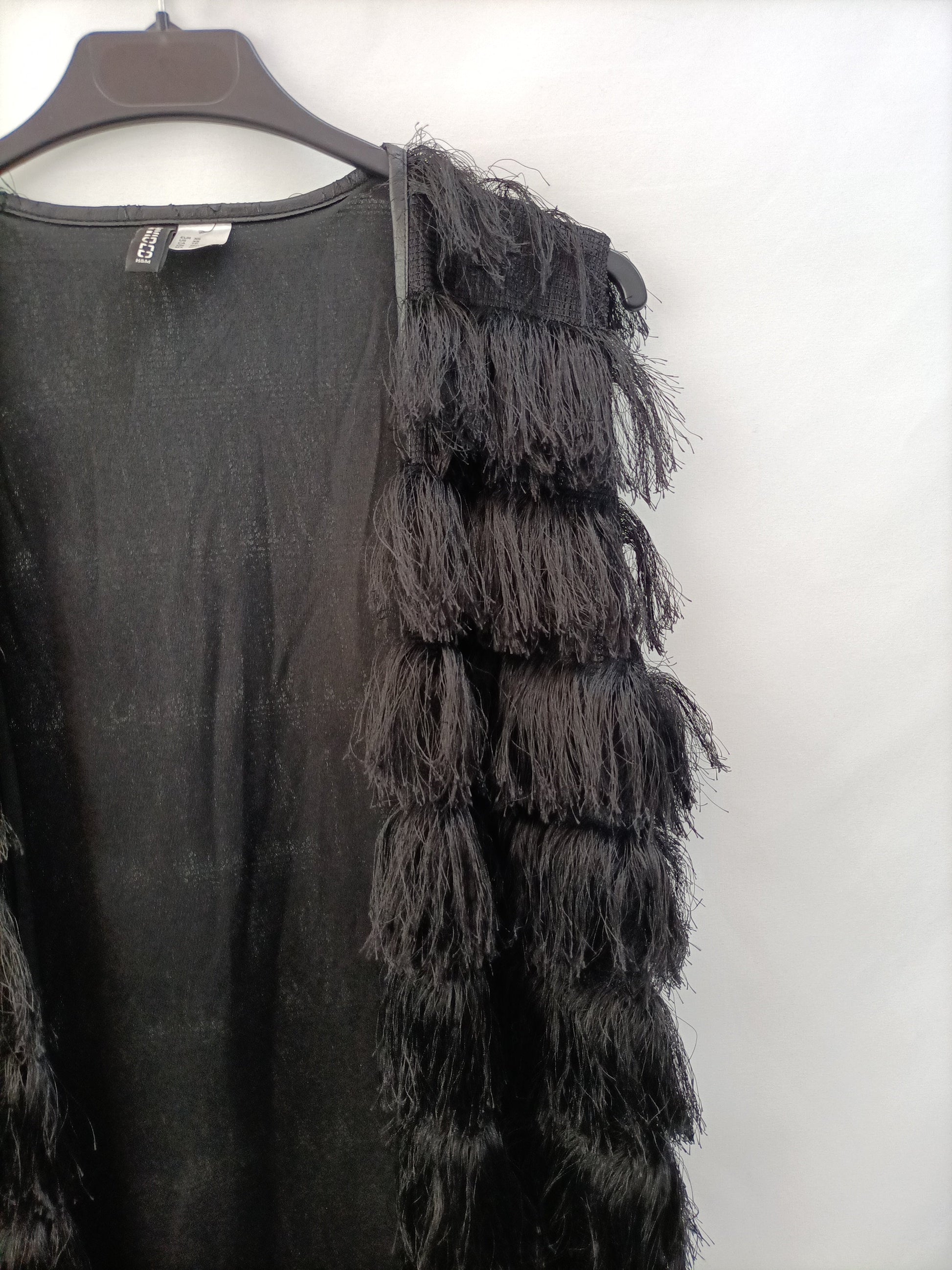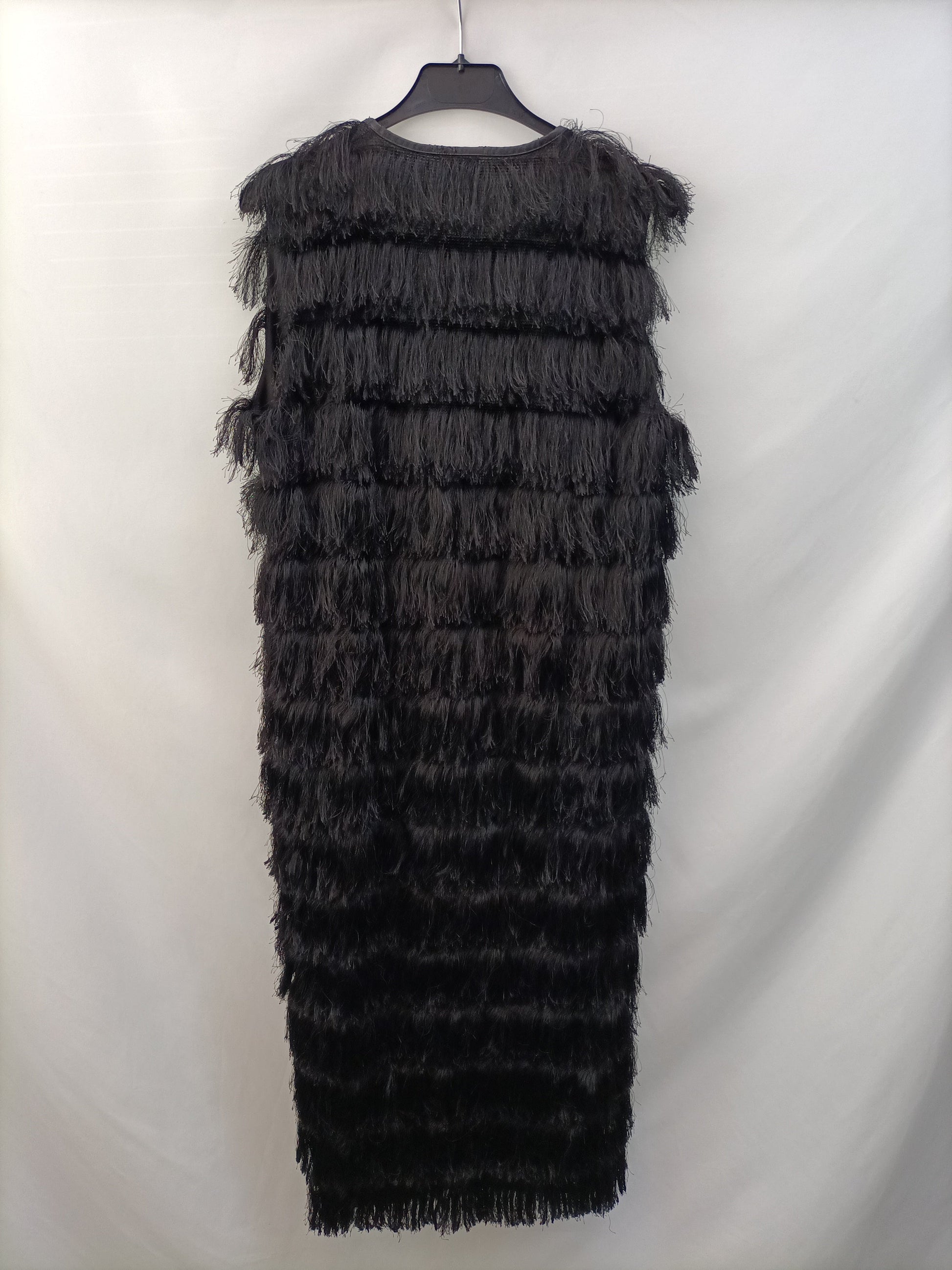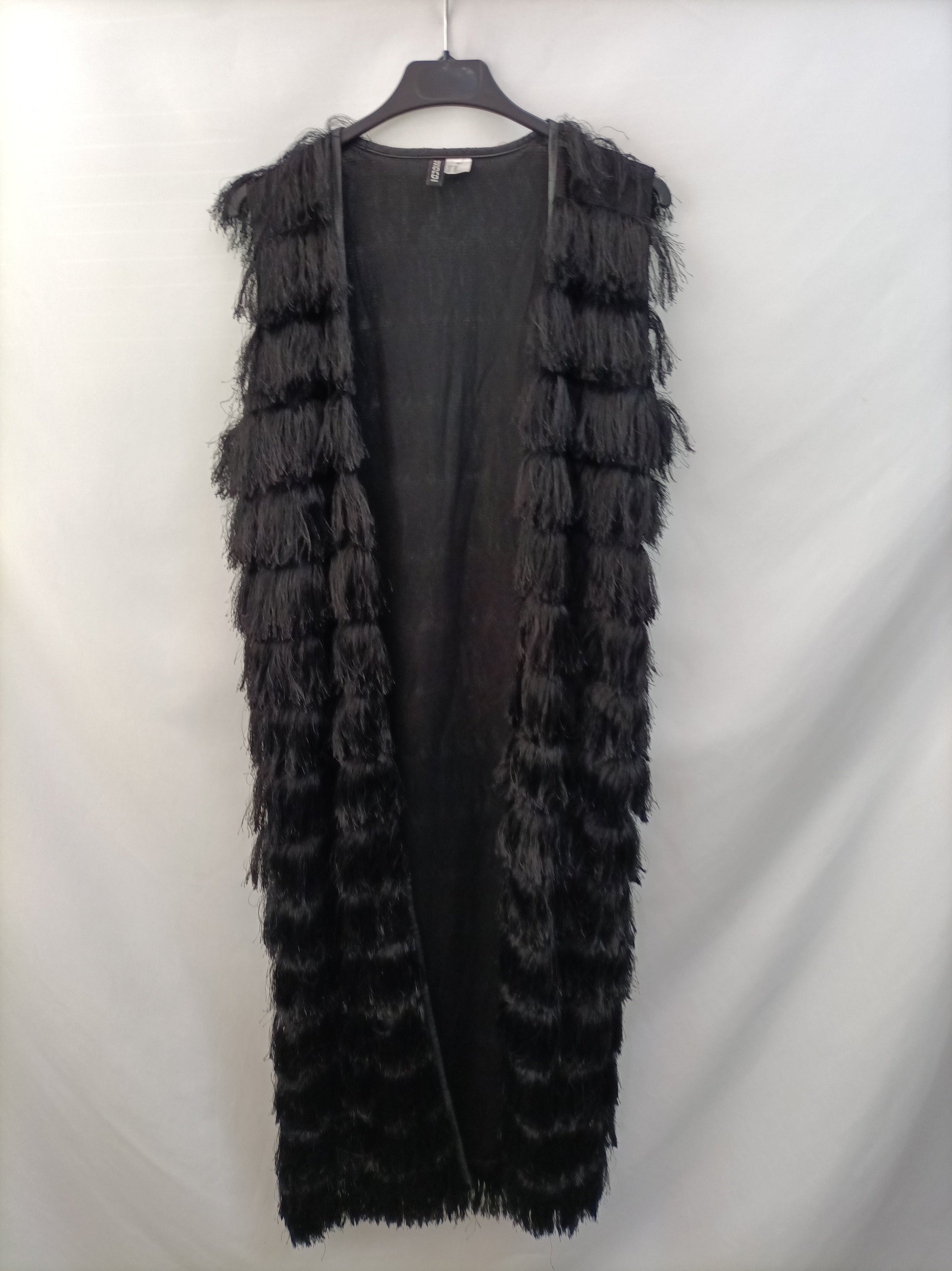 Chaleco negro con flecos, larguito. Abierto. Largo 111 cm. Tara: cuello un poco deshilachado