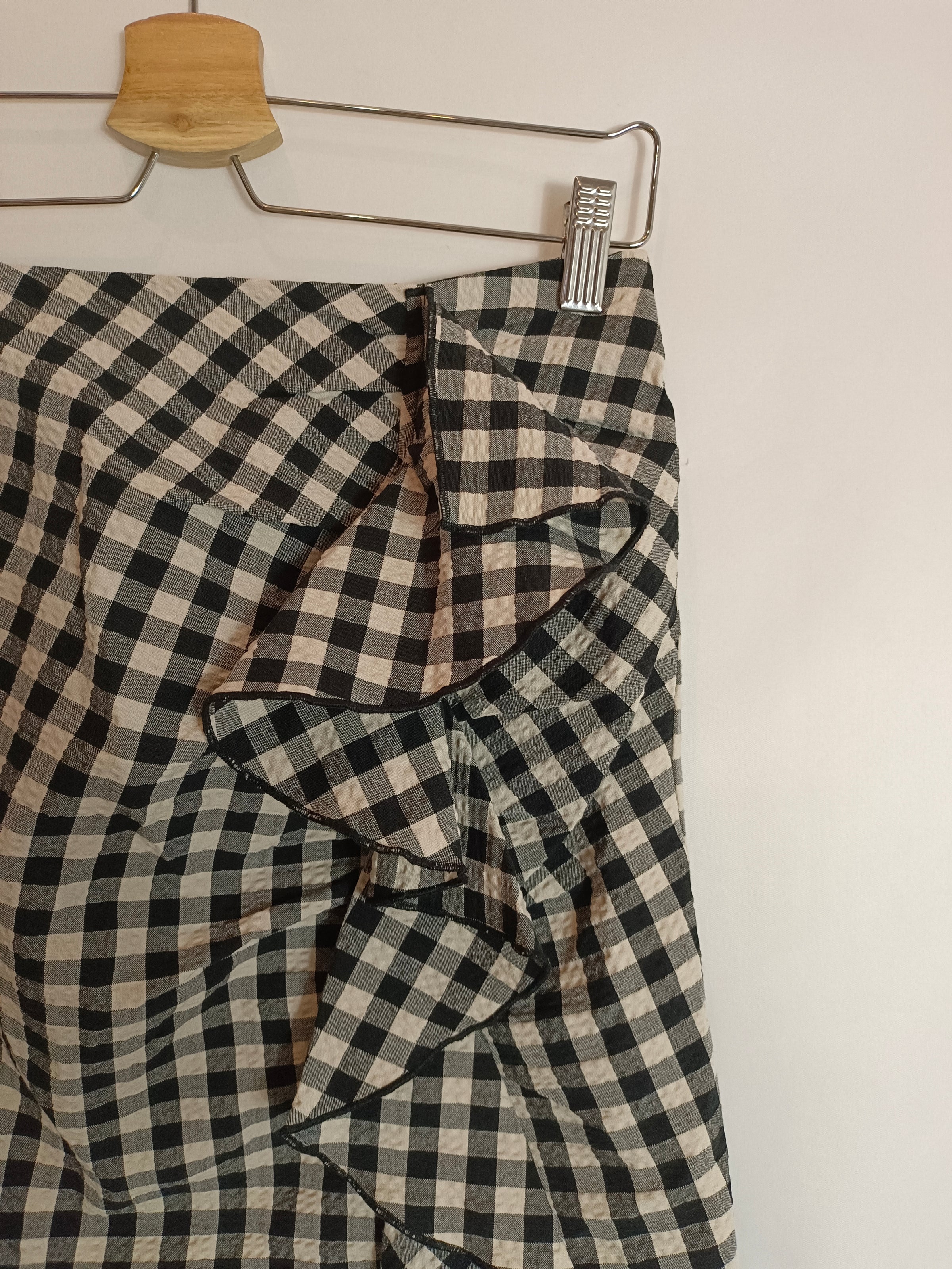 falda corta de cuadro vichí negra y beige. No elástica. Detalle de volante.