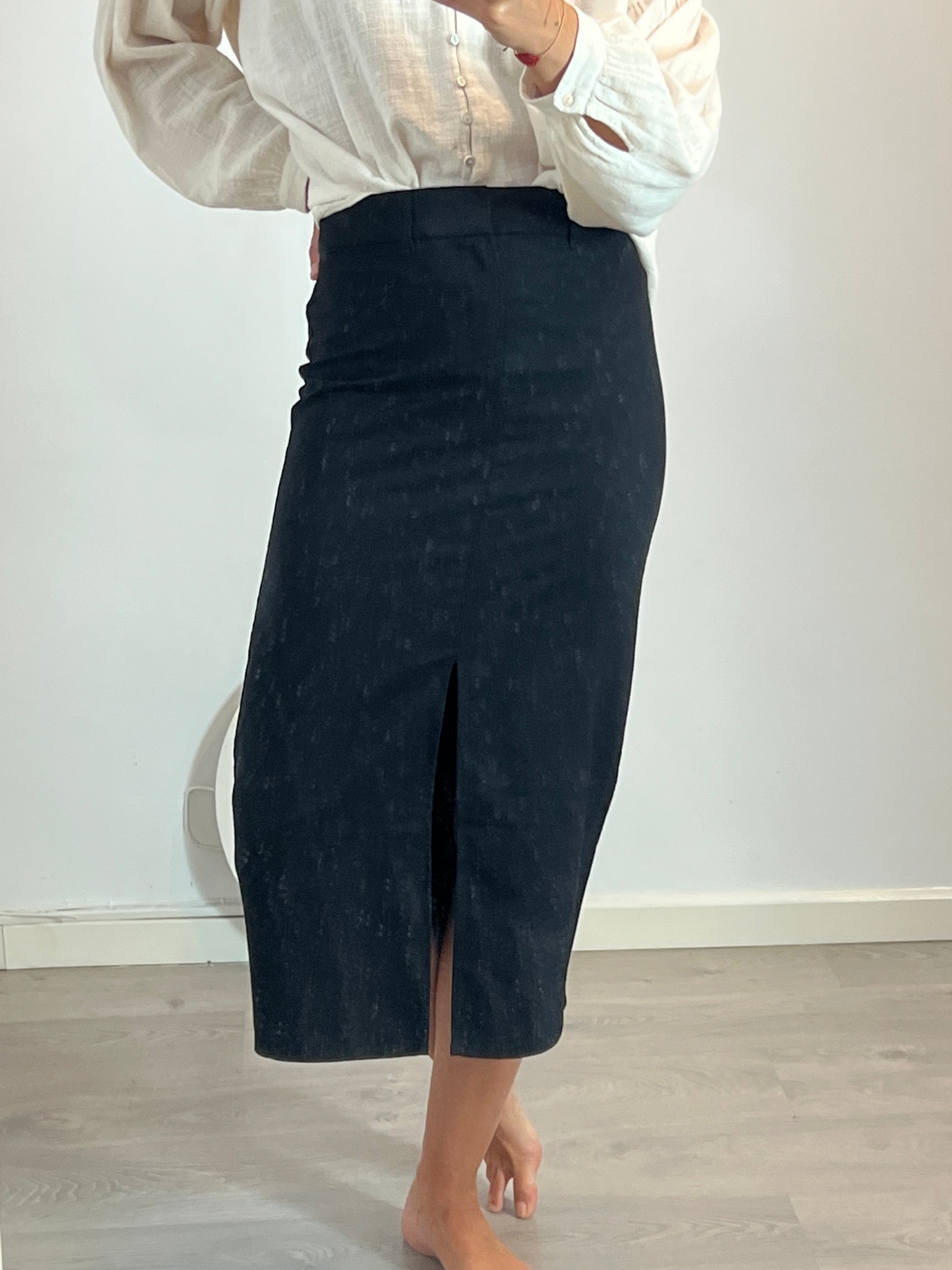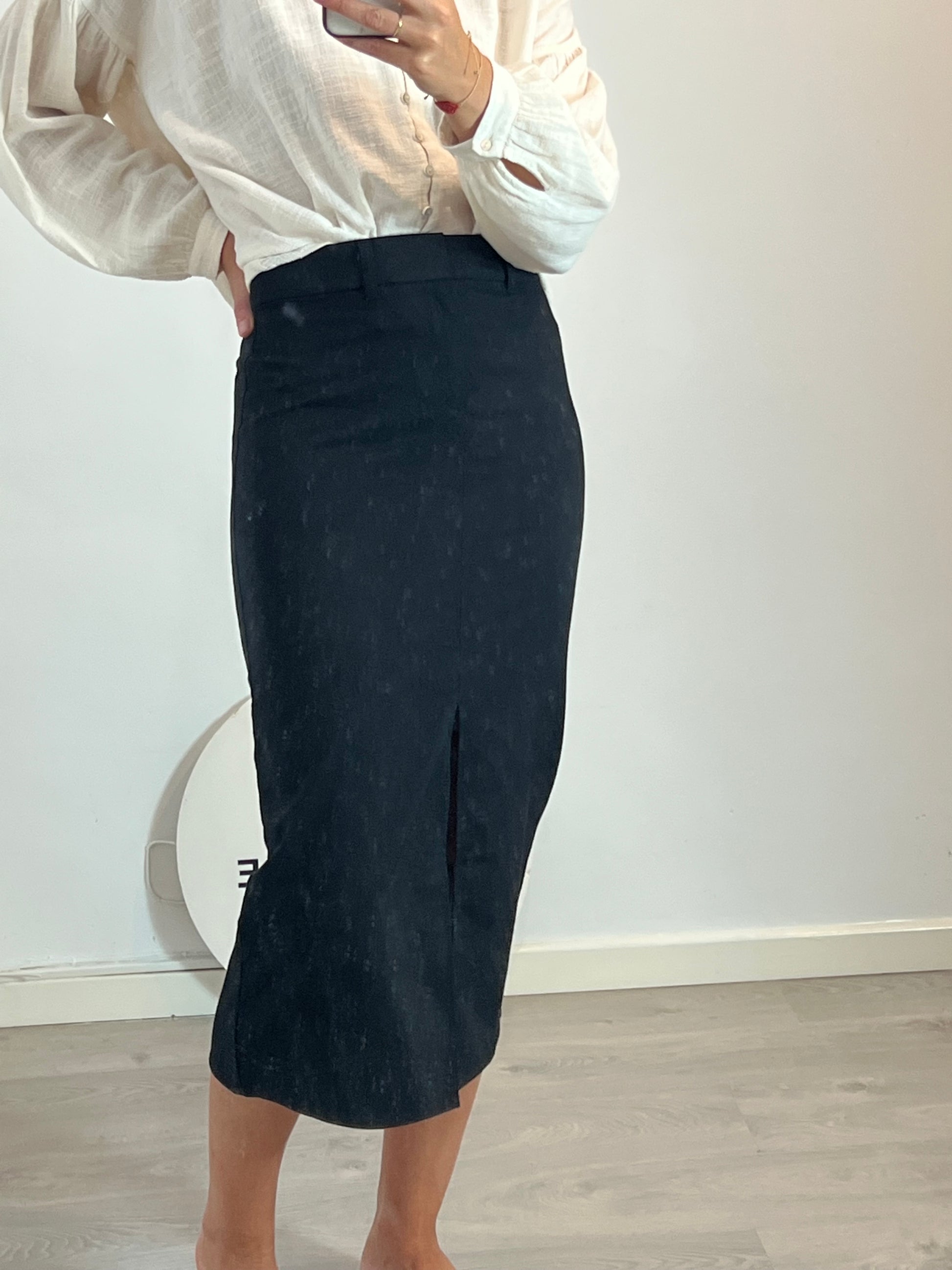falda midi negra recta no elástica . Cibtura 38cm, largo 83cm