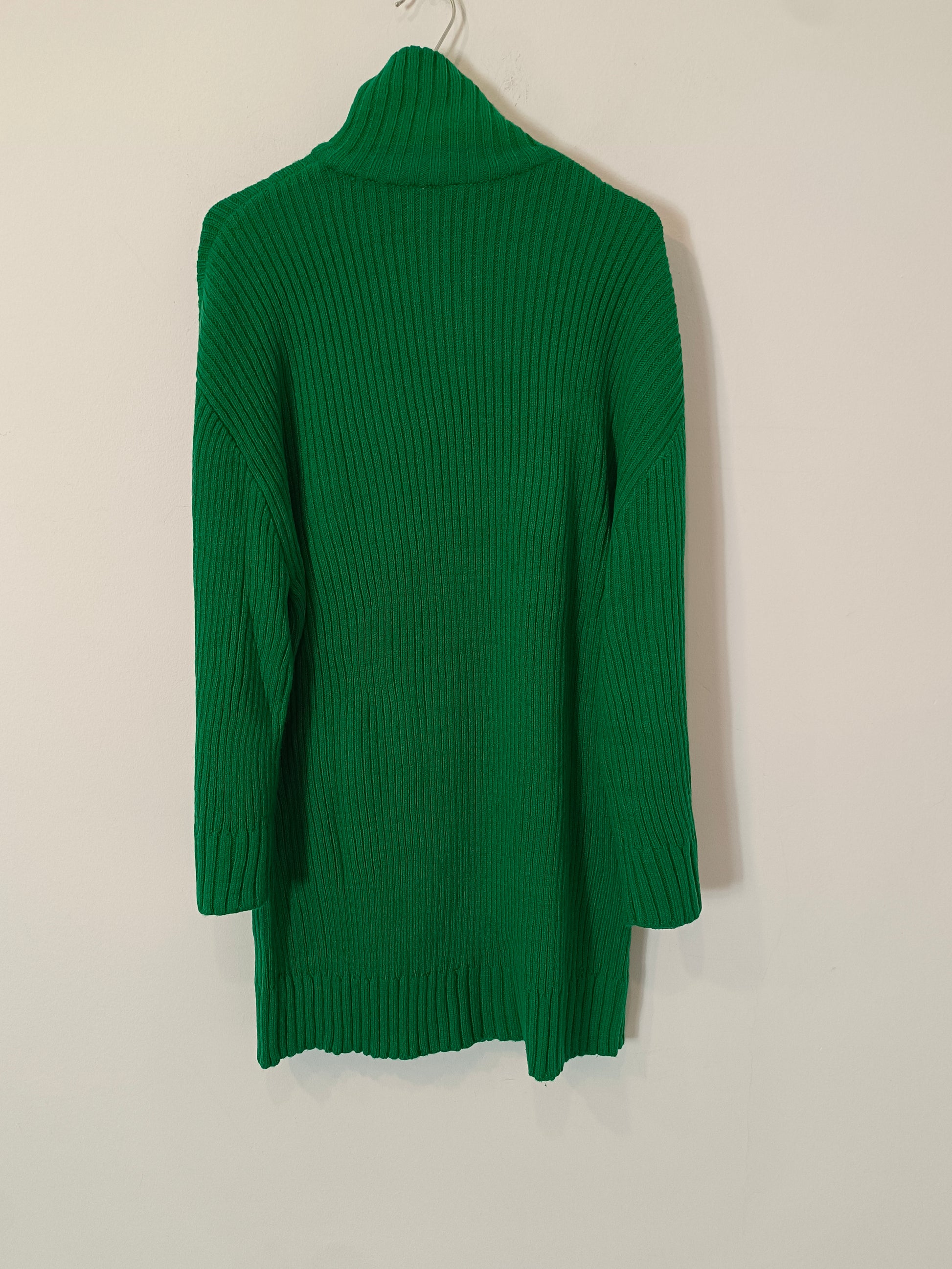 Jersey largo verde de canalé con el cuello alto con cremallera. Puede servir de vestido. Largo 82 cm
