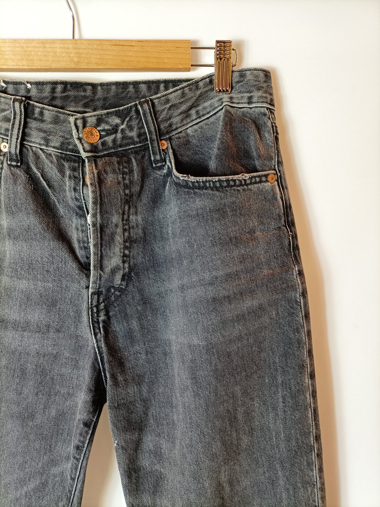 pantalón denim negro efecto desgastado. se cierra con botones. cintura 40 cm. tejido no elástico.