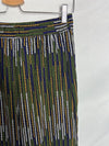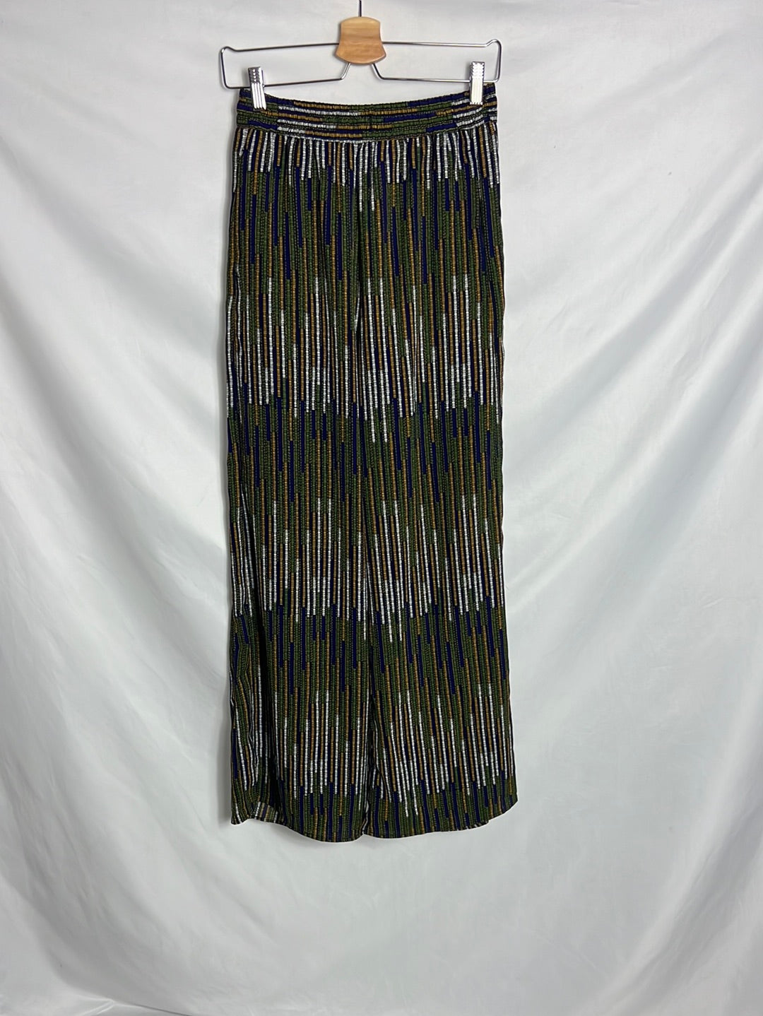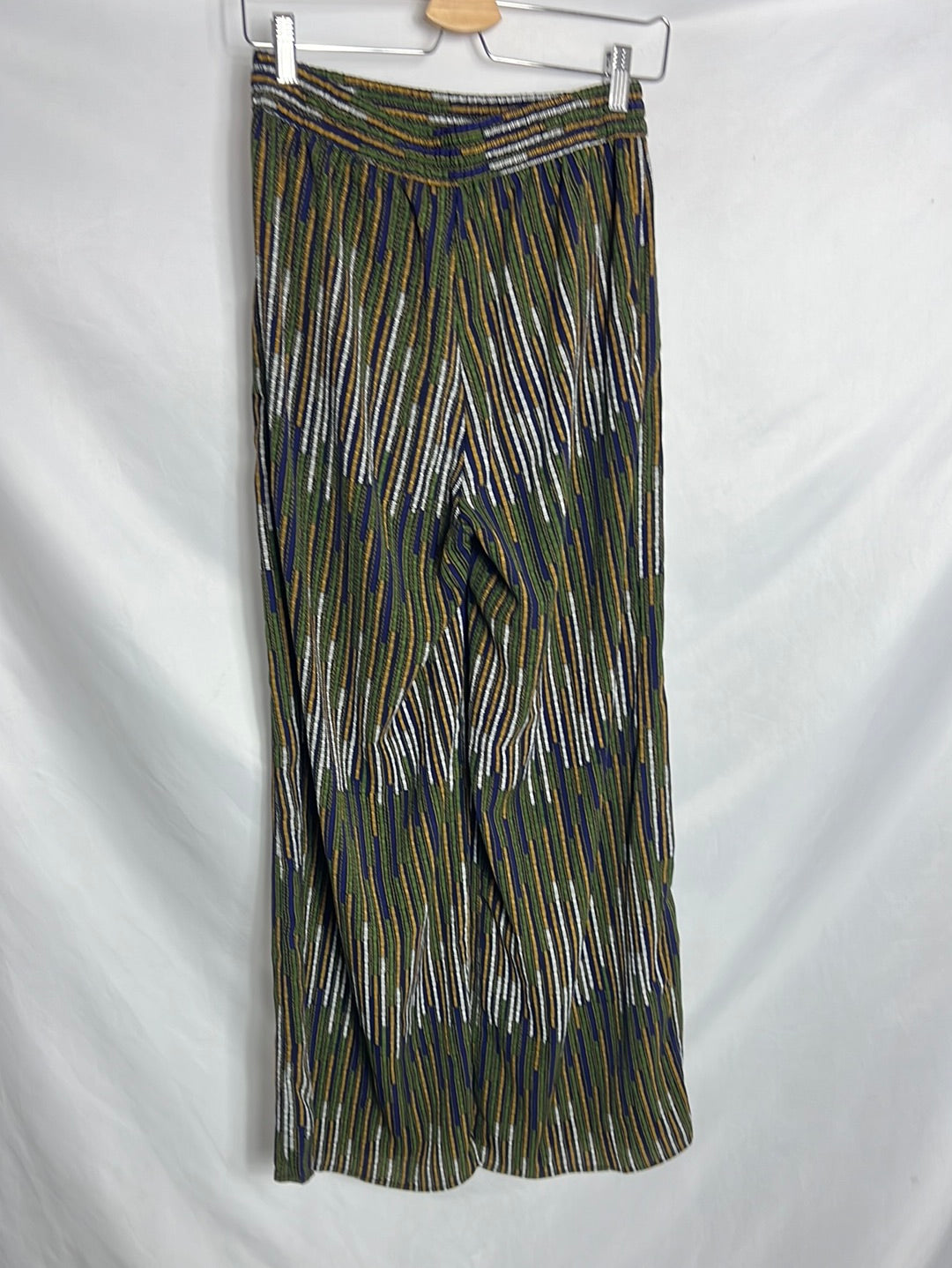 Pantalón fluido pata ancha azul estampado mostazas y verdes. Tiene bolsillos