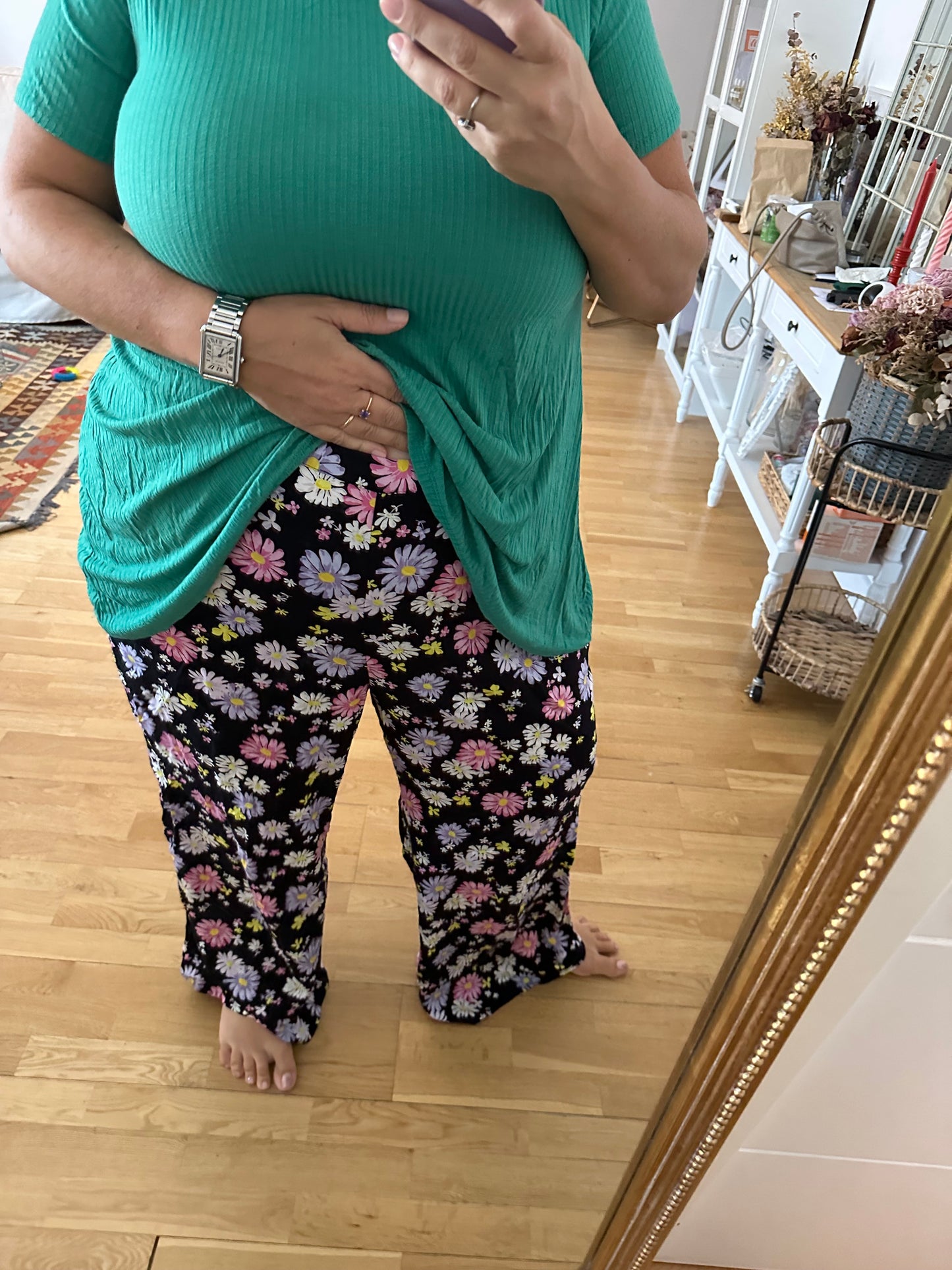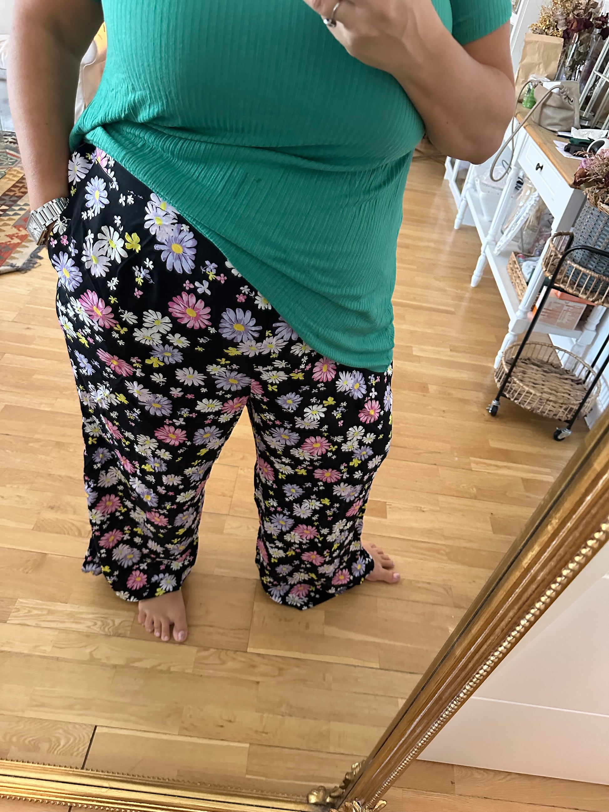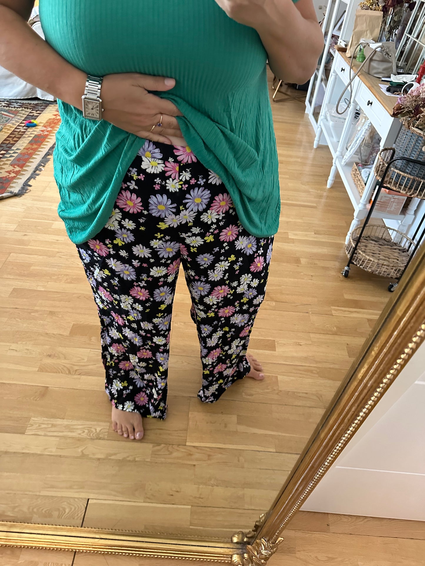 NUEVO CON ETIQUETA. Pantalón fluido negro flores. cintura elástica.