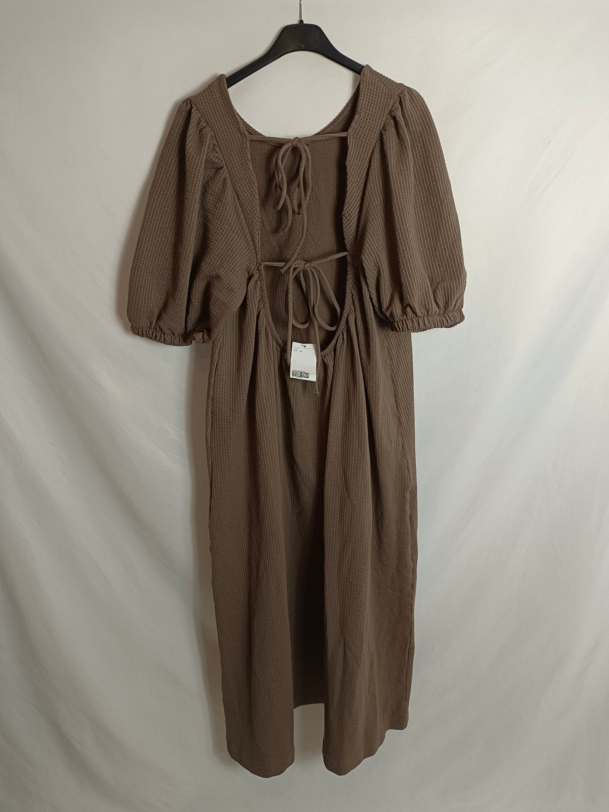 NUEVO CON ETIQUETA. Vestido verde largo de tejido con textura elástica. Espalda al aire con cuerda