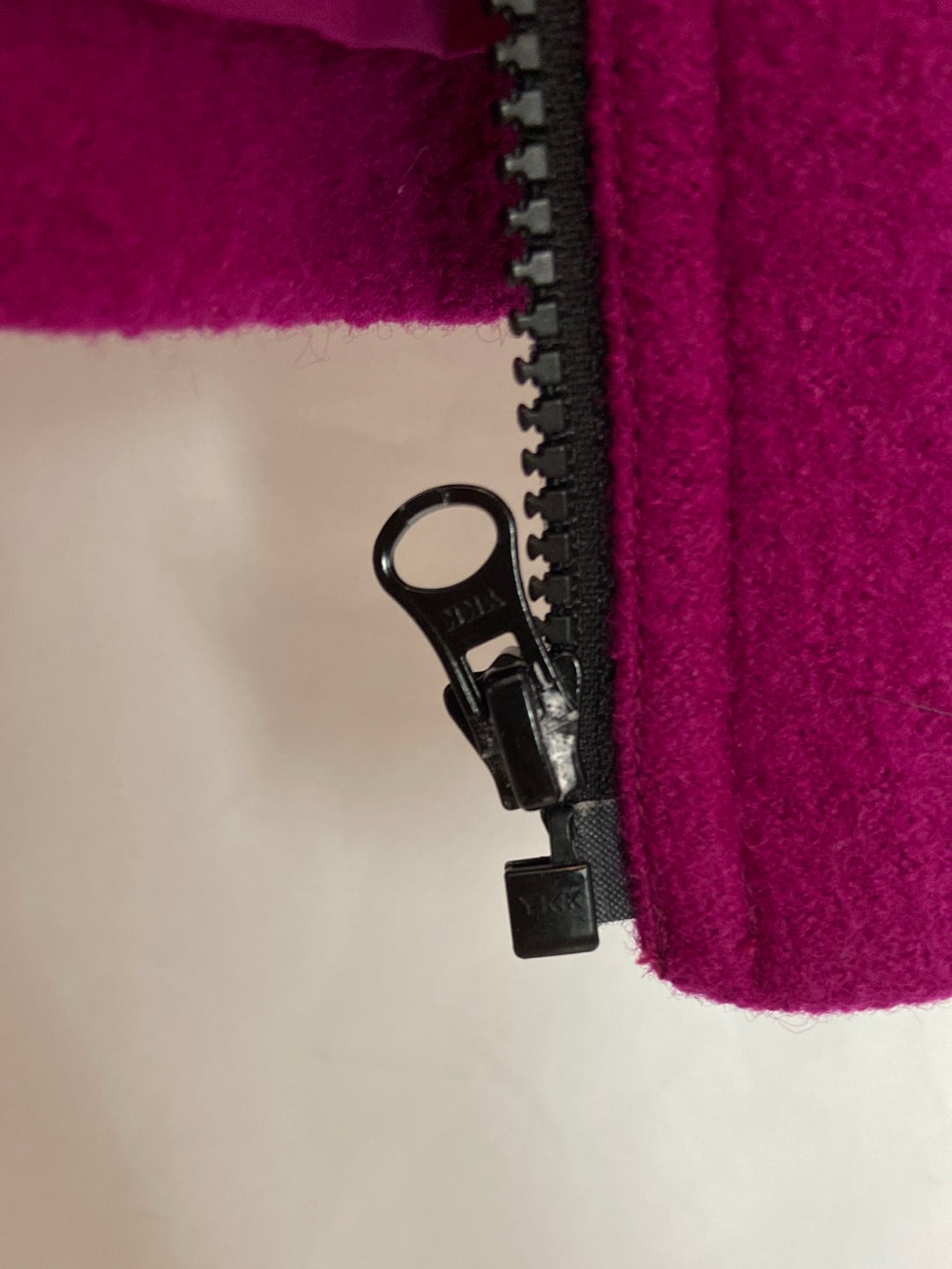 Abrigo morado textura detalle botones. Tara: la cremallera no cierra.