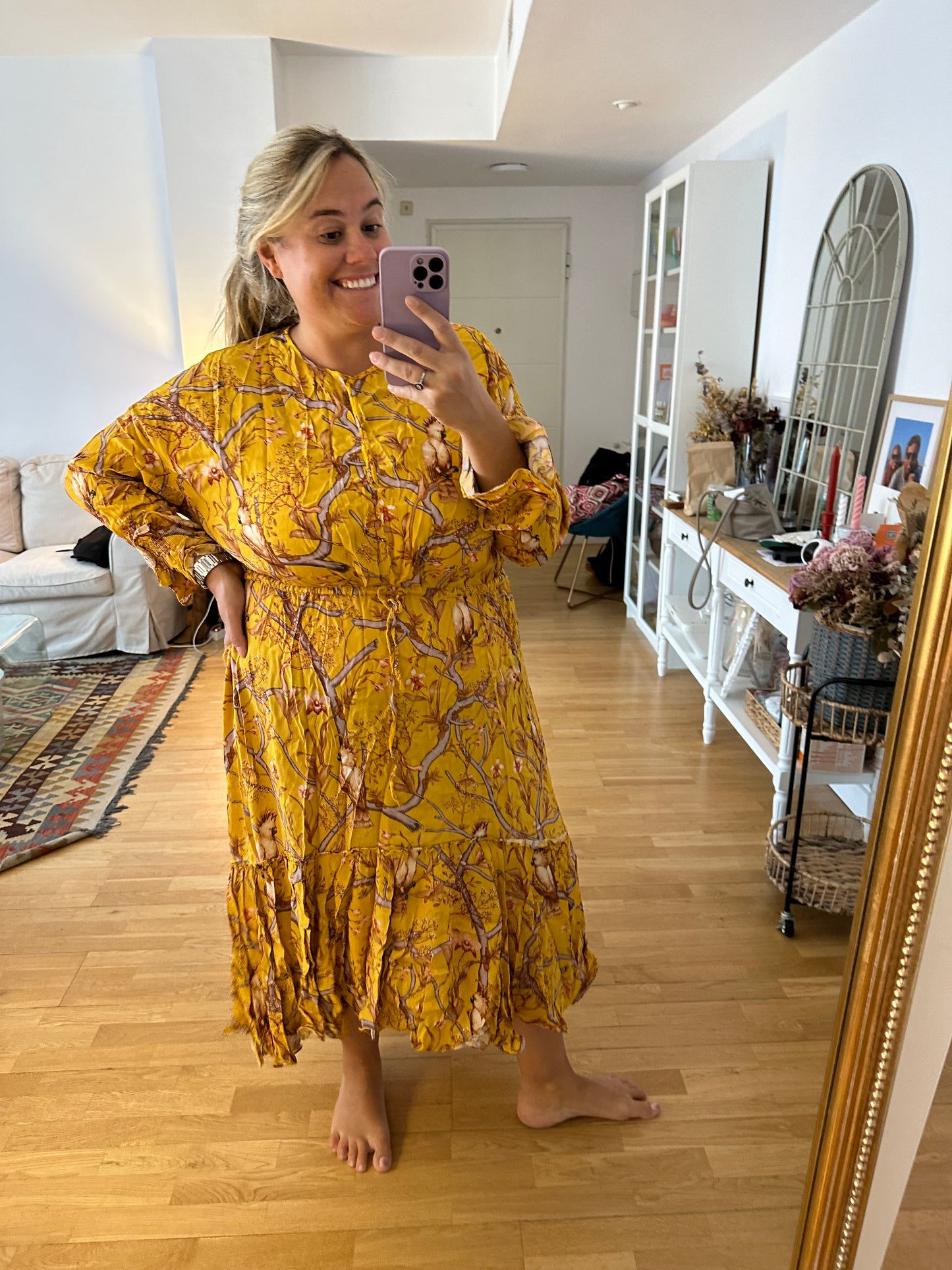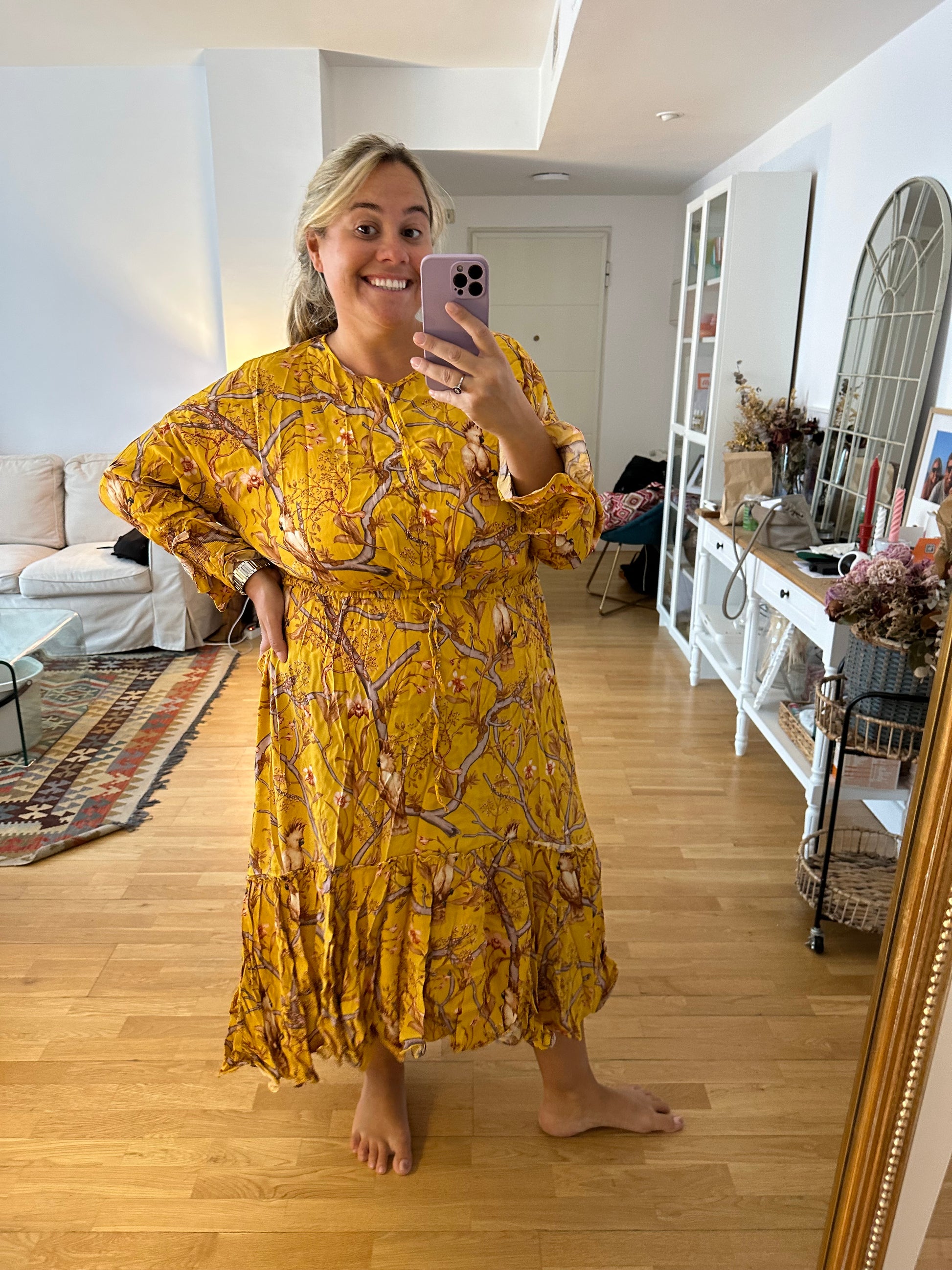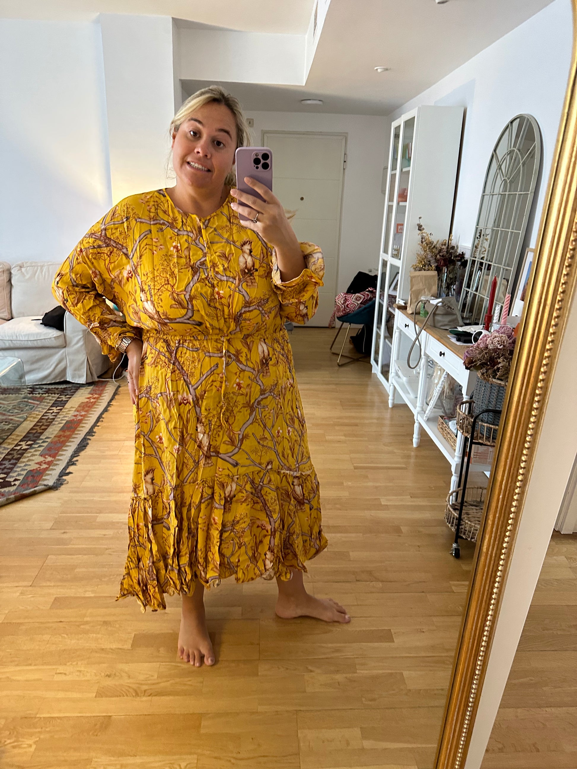 vestido mostaza con flores. Ajustable debajo del pecho. Colección Joanna Ortiz