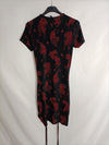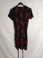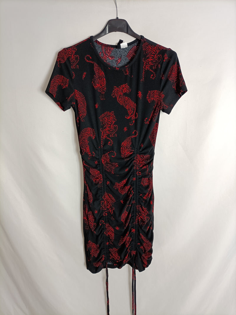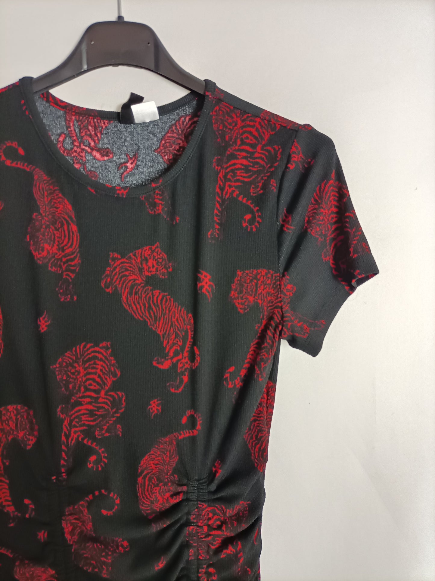 vestido corto negro con estampado de tigres rojos. elástico y fruncible