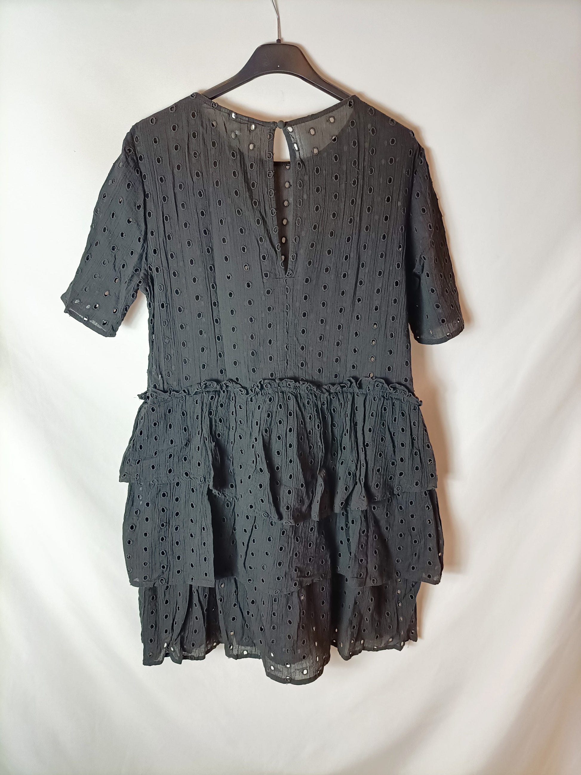 vestido negro claro troquelado con la falda de volantes. de sisa a sisa 42 cm