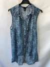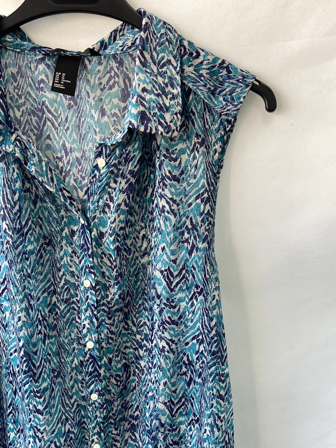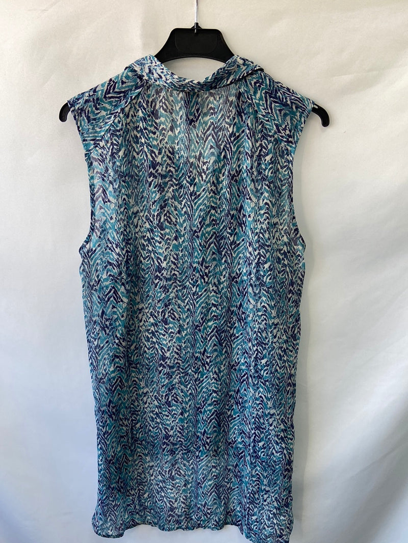 Blusa con estampado asimétrico, es fluida y semitransparente sin mangas. Más larga por detrás. De sisa a sisa 50 cm, largo delantero 65 cm, largo trasero 70 cm