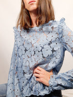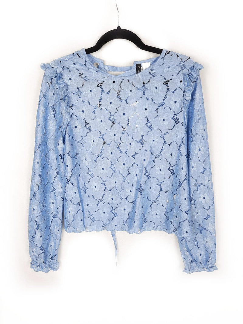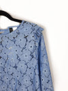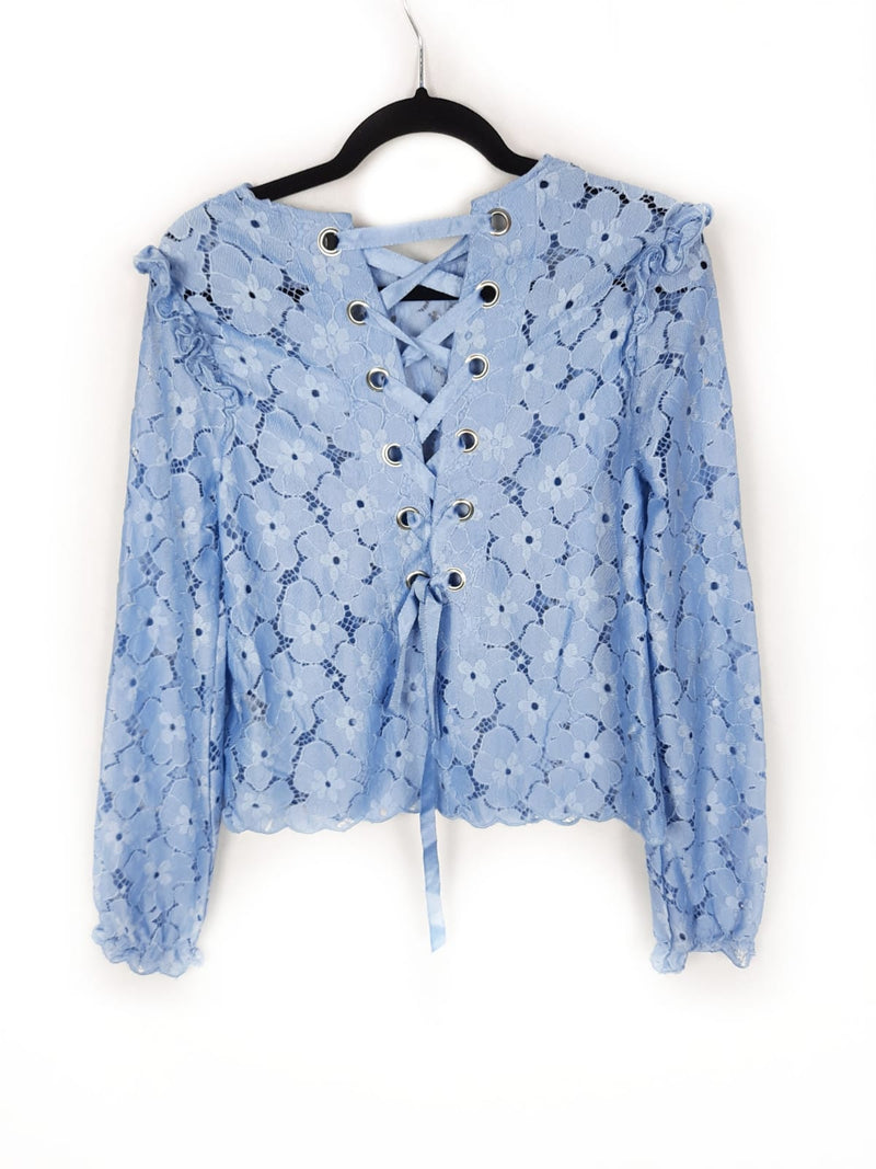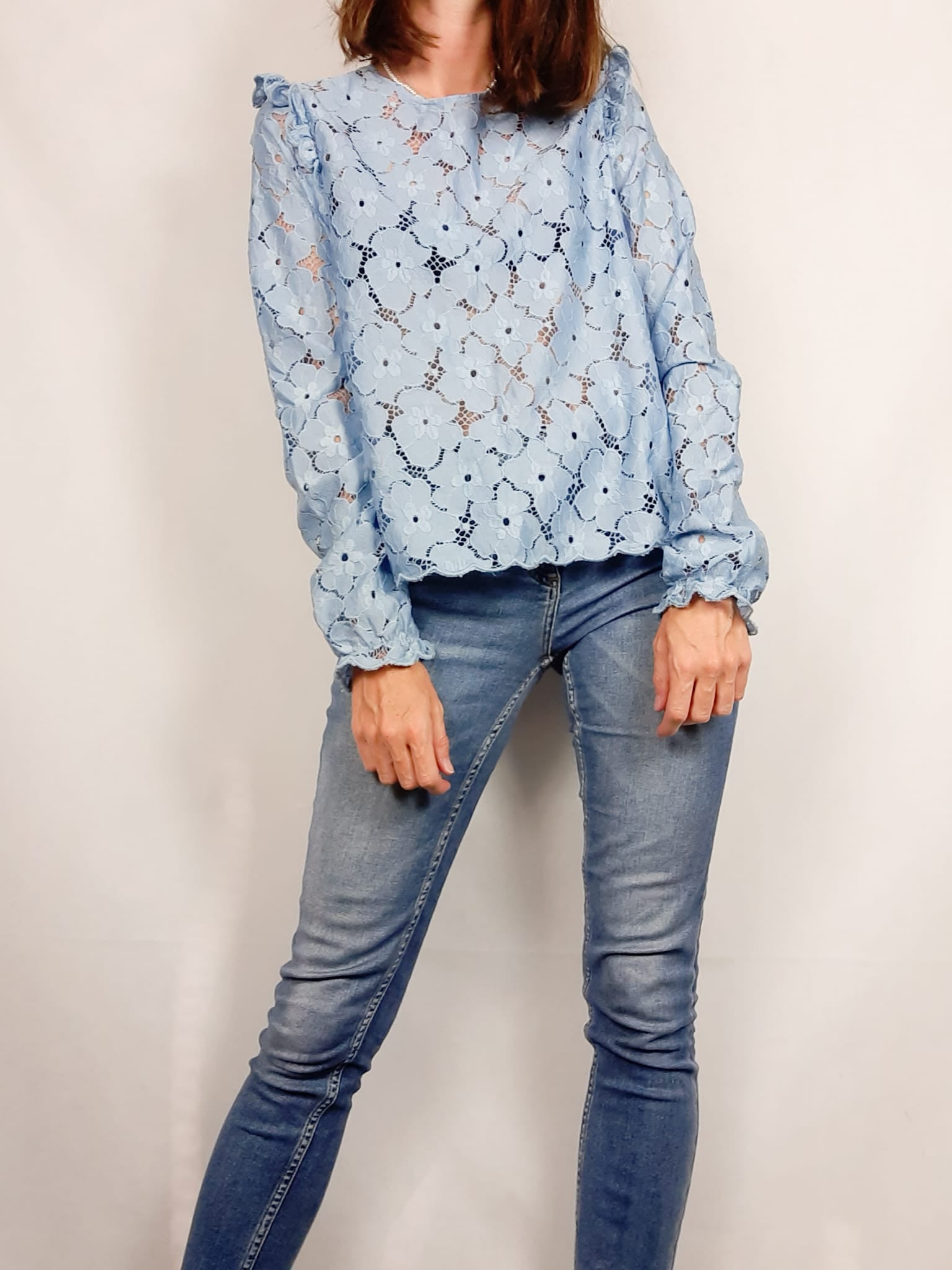 NUEVA CON ETIQUETA. Blusa azul del encaje con flores. Mangas ajustadas en la muñeca, volantes en los hombros y no es elástica. De sisa a sisa 45 cm, largo 54 cm