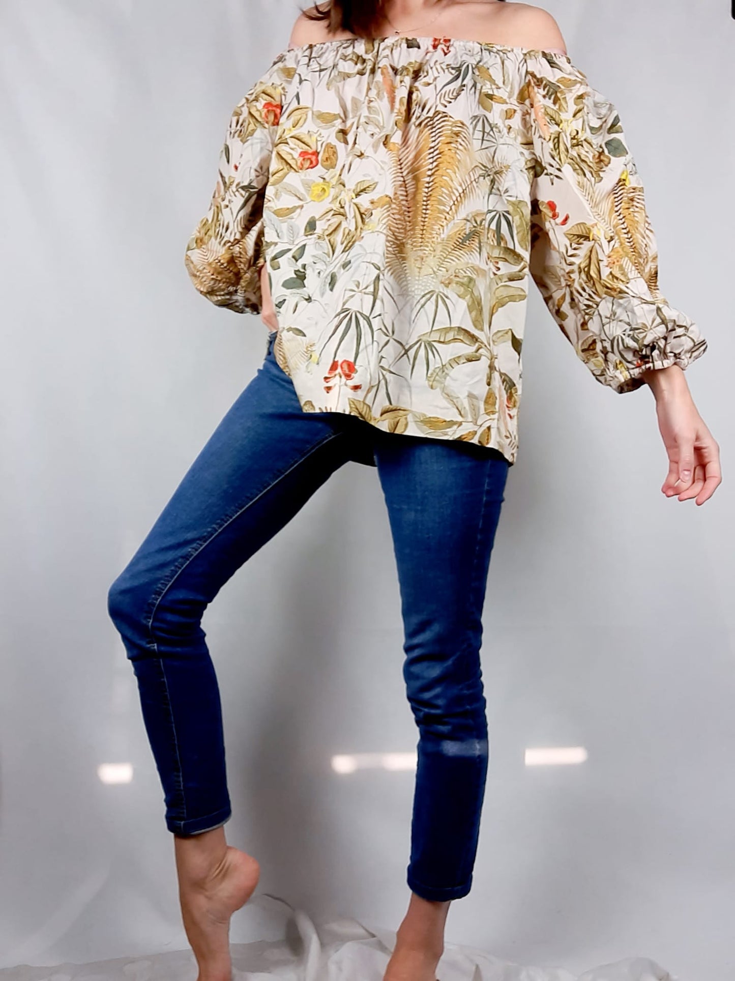 Blusa de flores cuello barco elástico, mangas con elástico abullonadas. Es fluida. Largo 53 cm