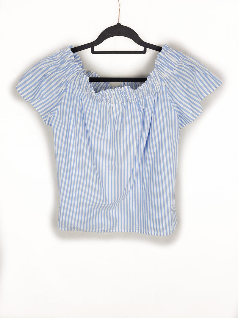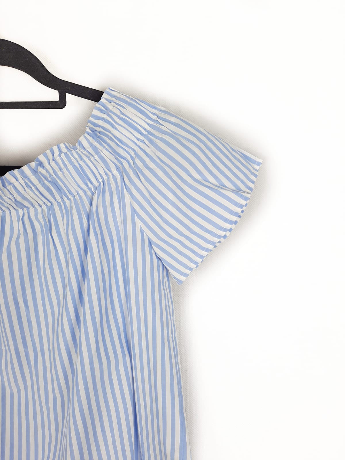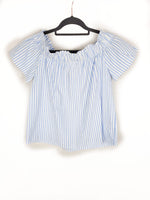 Blusa de rayas celeste y blanca fluida con el cuello barco elástico. De sisa a sisa 54 cm largo 56 cm