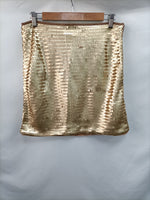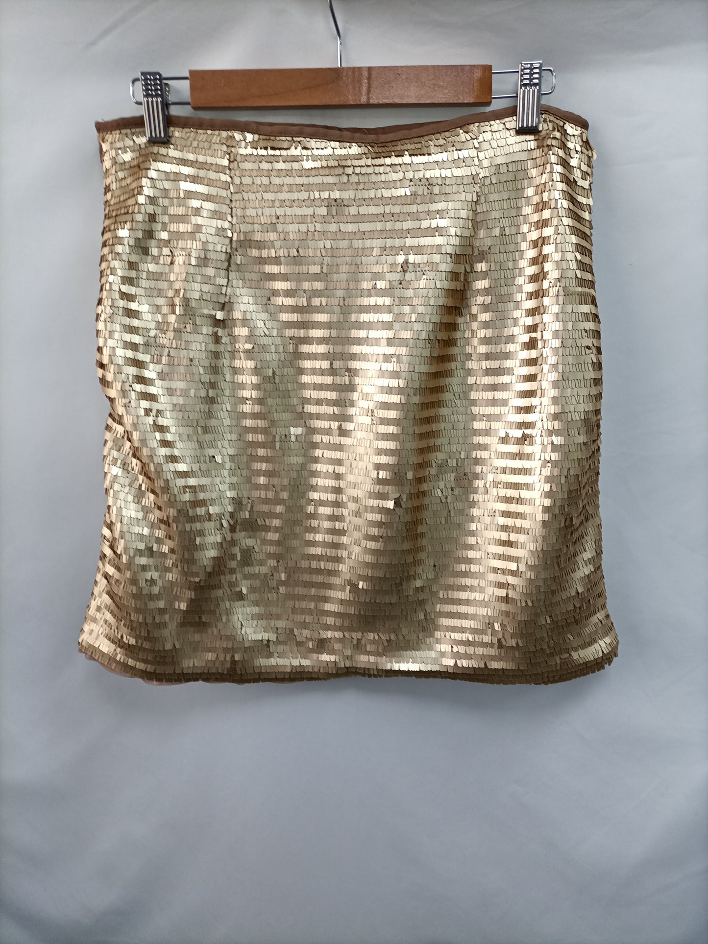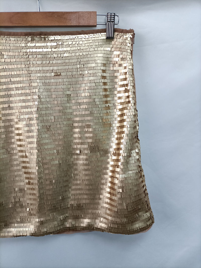 Falda corta recta con lentejuelas doradas, se abrocha con cremallera y no es elástica.