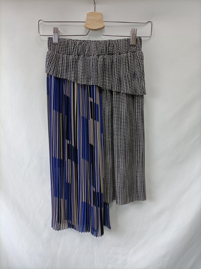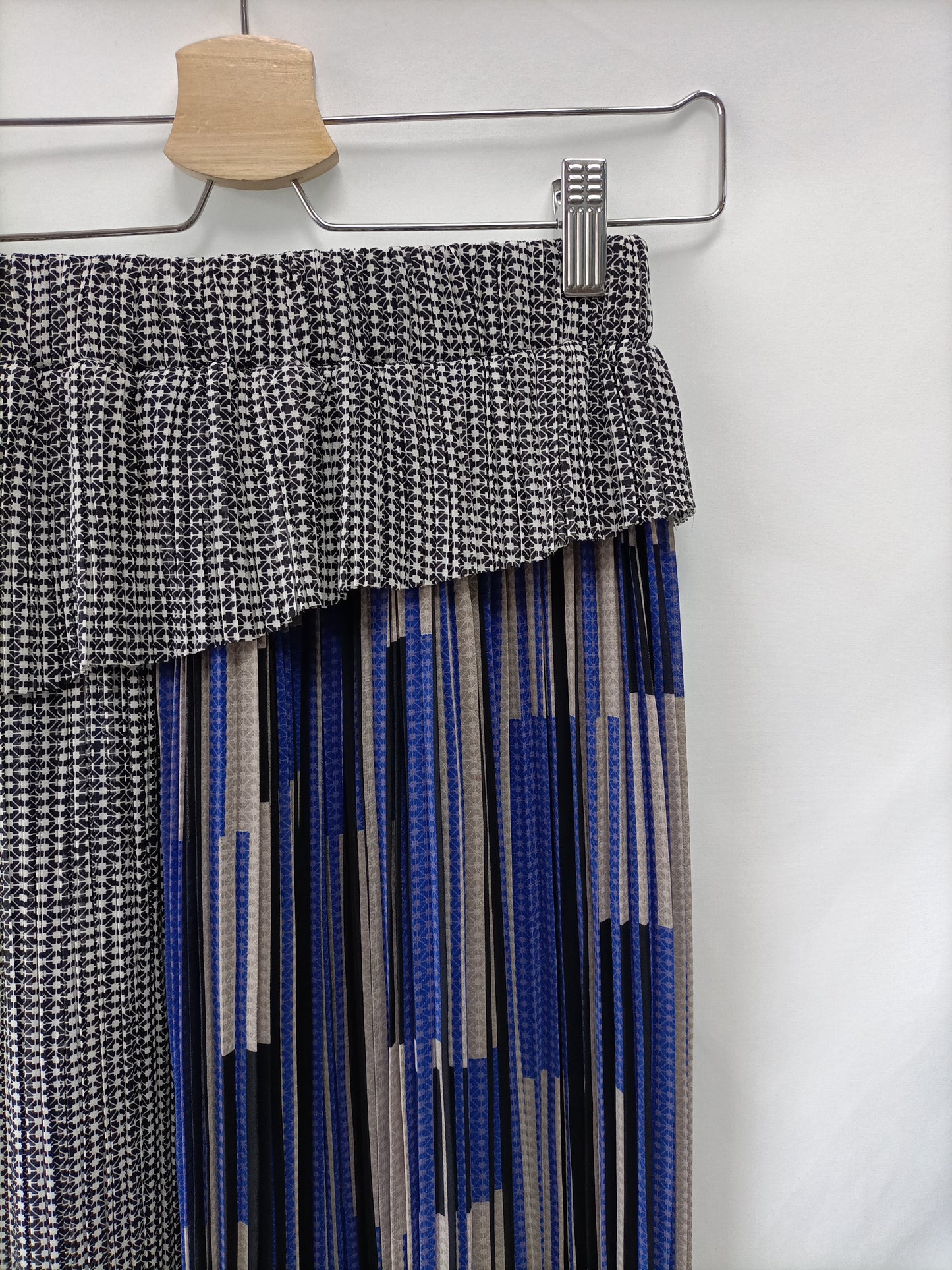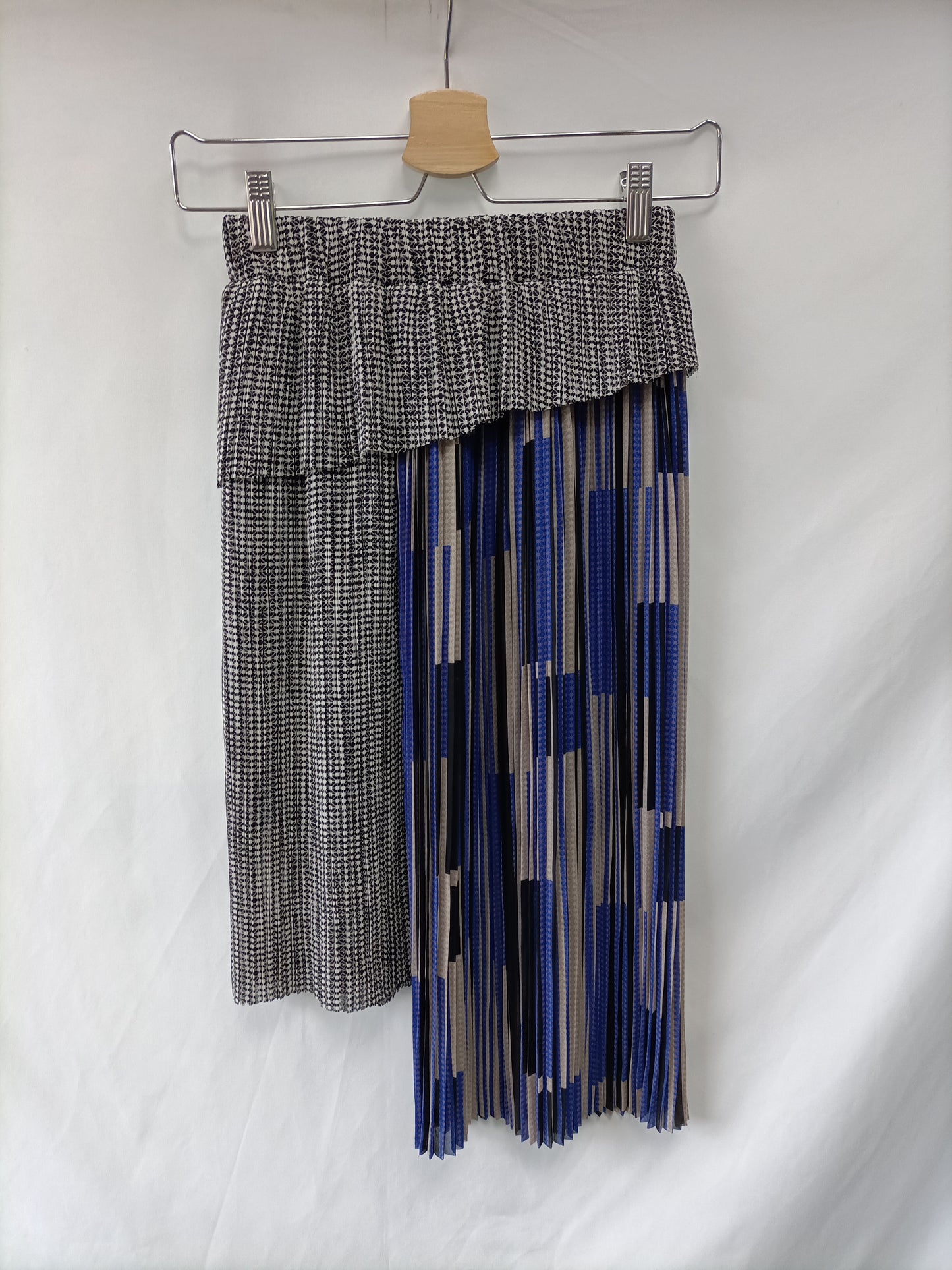 Falda plisada en varios estampados. Volante en la cintura. Largo asimétrico.