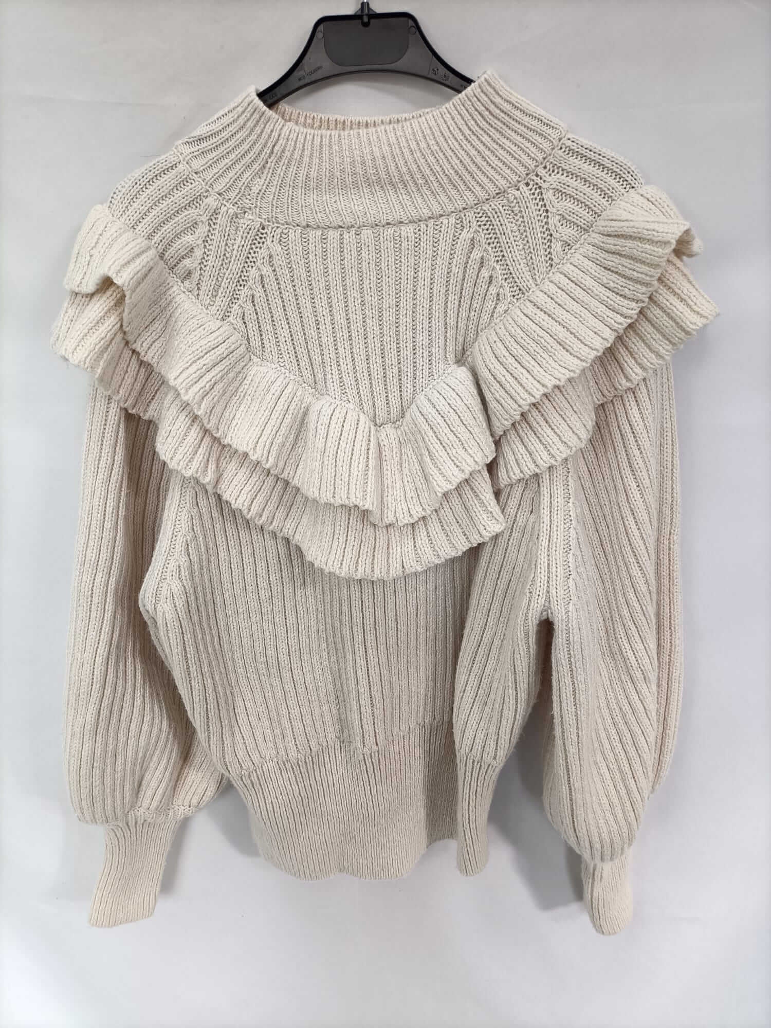 Hym. M. Jersey beige de canalé con el cuello perkins y volantes en el escote. Mangas Abullonadas. Largo 68 cm