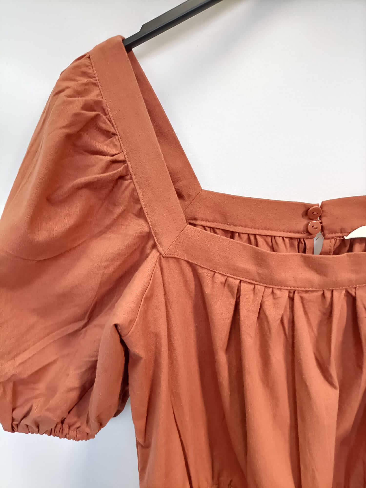 Hym. 38. Mono corto color teja de algodón con la cintura elástica con cinturón incorporado de rafia. Mangas Abullonadas. De sisa a sisa 38 cm largo 81 cm