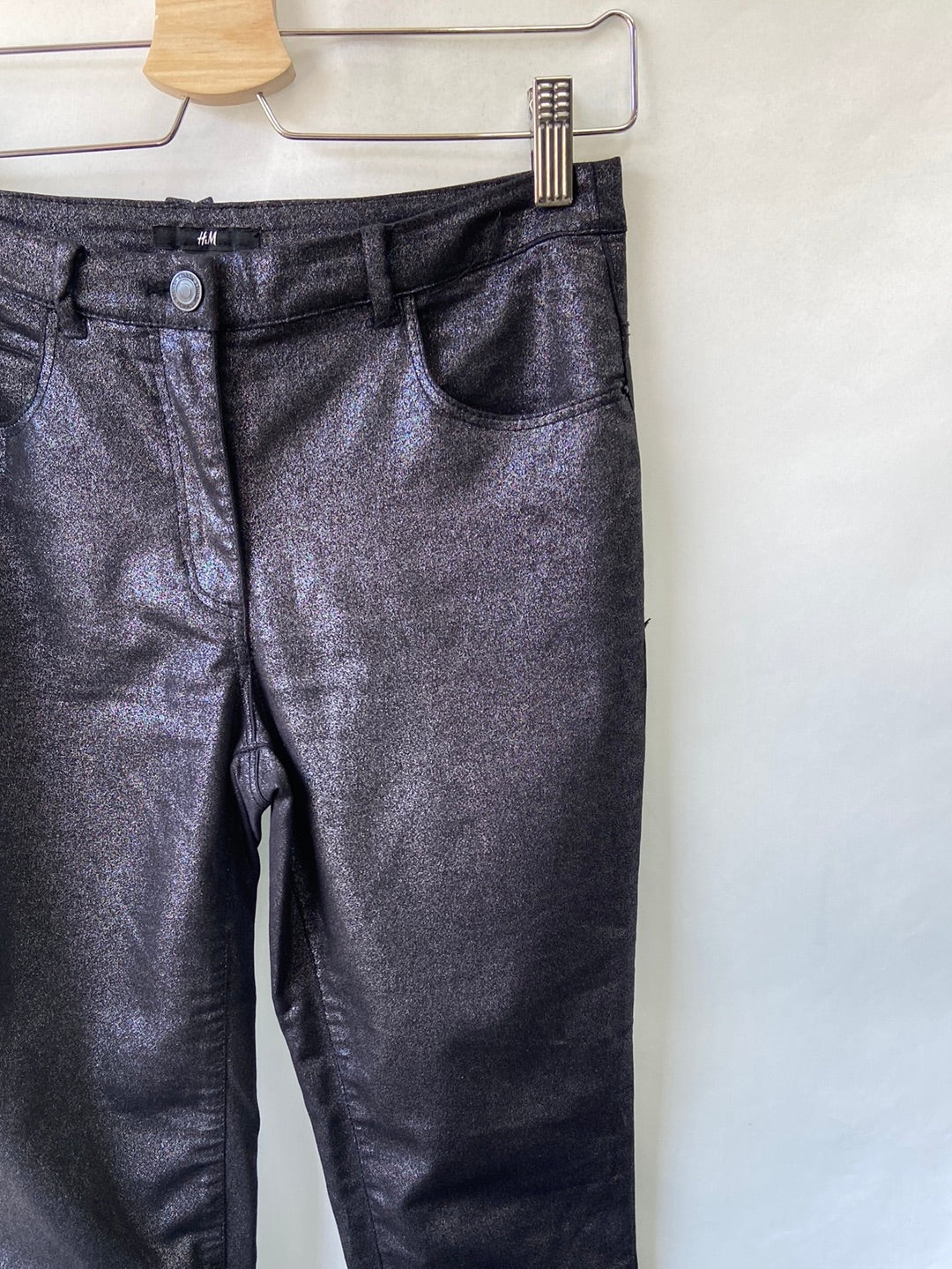 Pantalón pitillo negro encerado con purpurina plateada. Es elástico. Largo 99 cm