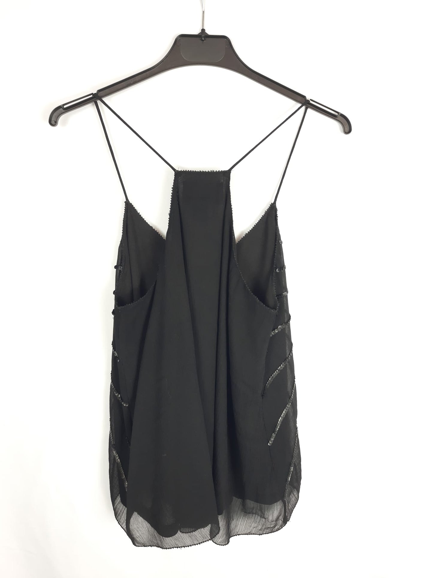 Hym. Top negro fluido con lentejuelas en la parte delantera. No elástico. De sisa a sisa 47 cm largo 52 cm