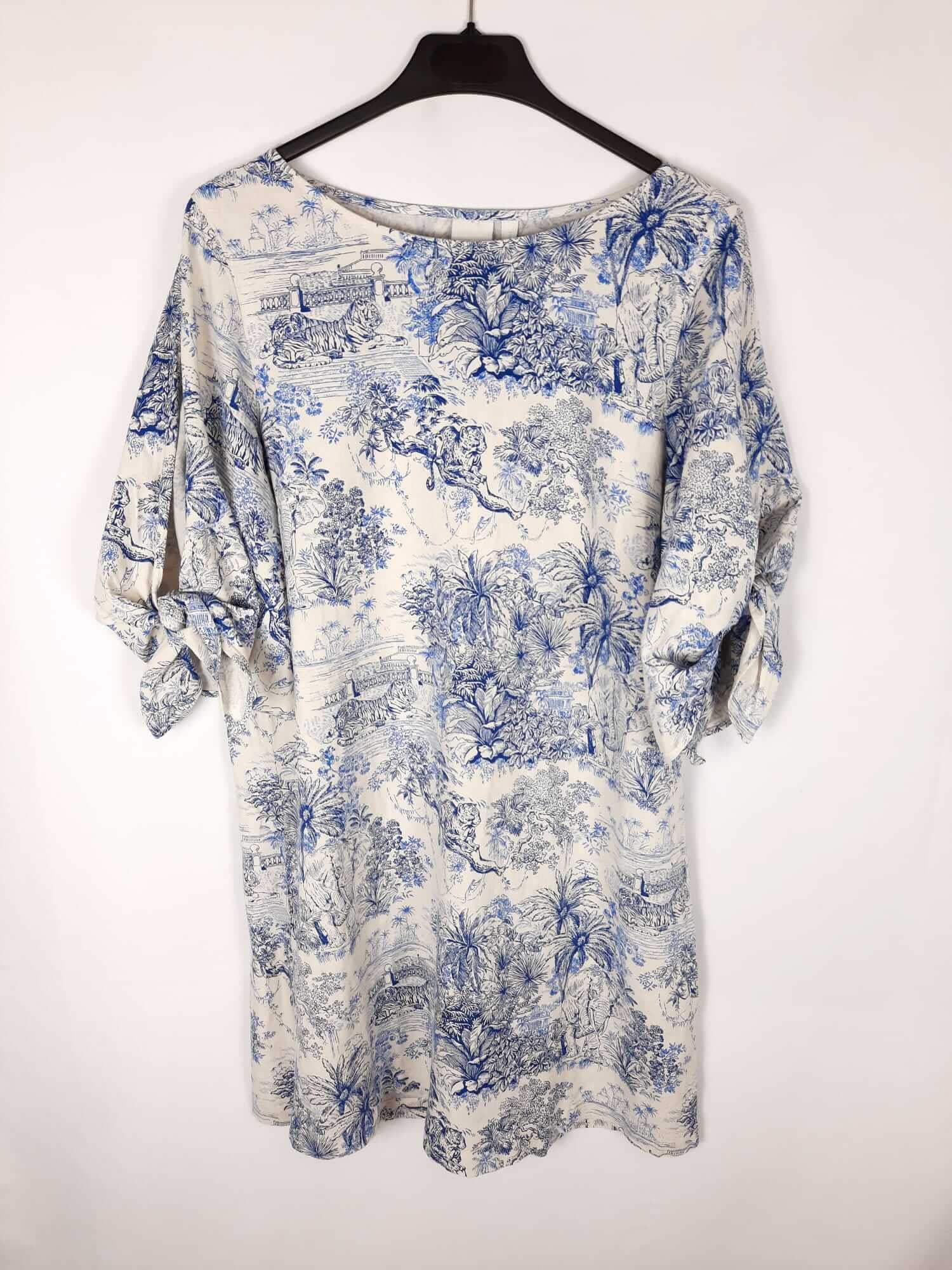 Hym. Vestido corto de lino con estampado de flores. Mangas 3/4 abierta con lazada. No elástico. De sisa a sisa 49 cm largo 88 cm